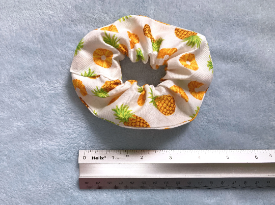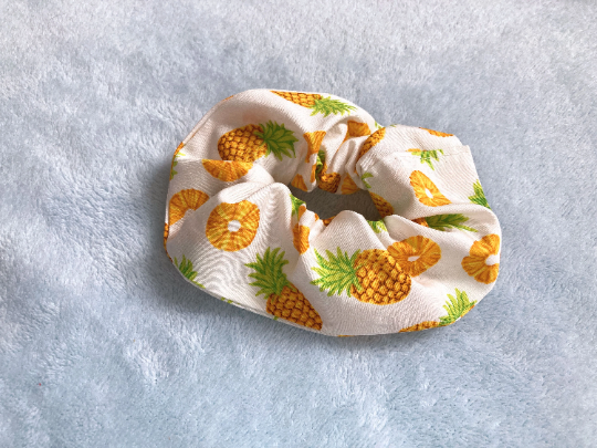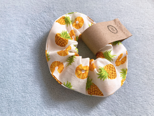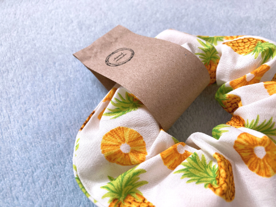 Large, handmade cotton scrunchy made from Rose & Hubble pineapple chunks fabric. If you like Piña Coladas and getting caught in the rain, this is the accessory for you!