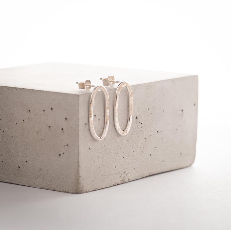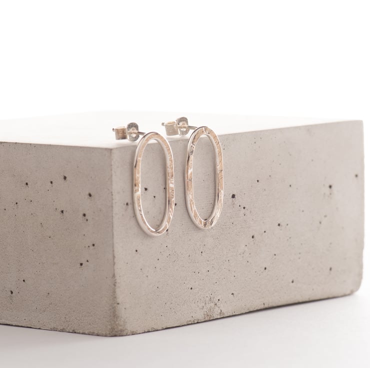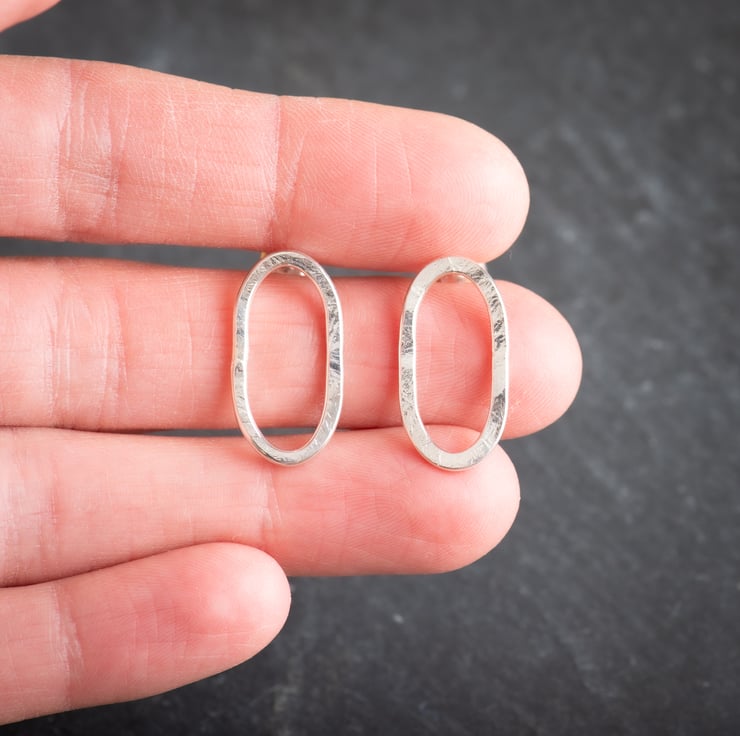 To make these studs I shape, solder, hammer and polish by hand. The old hammer that I use to texture the ovals leaves an interesting light catching texture. I give the earrings a brightly polished finish, which I think contrast nicely with the non-traditional texture.