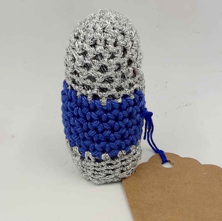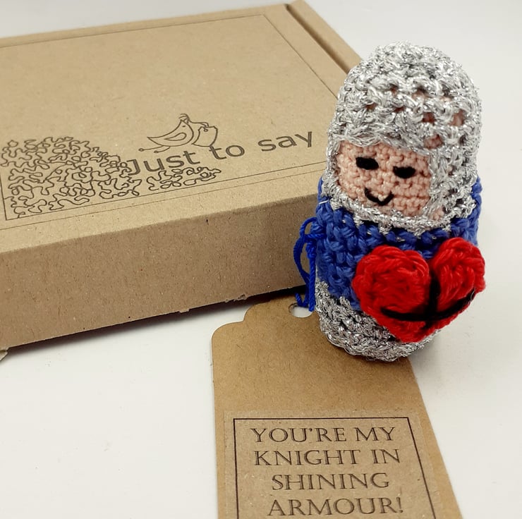 This little fellow is all ready to deliver a message on your behalf and would make a lovely keepsake alternative to a greetings card. He is crocheted in a mix of yarns from a pattern adapted from one by Lucy Ravenscar. He is filled with polyester stuffing and grey fabric. There is a 1p coin in the base to help him stand. He carries a heart - shaped shield and there is a tag attached which reads 'You are my knight in shining armour ' although I am very happy to exchange this tag for one with a message of your choice.