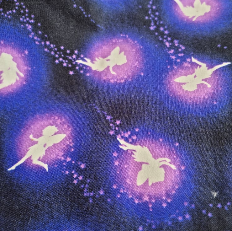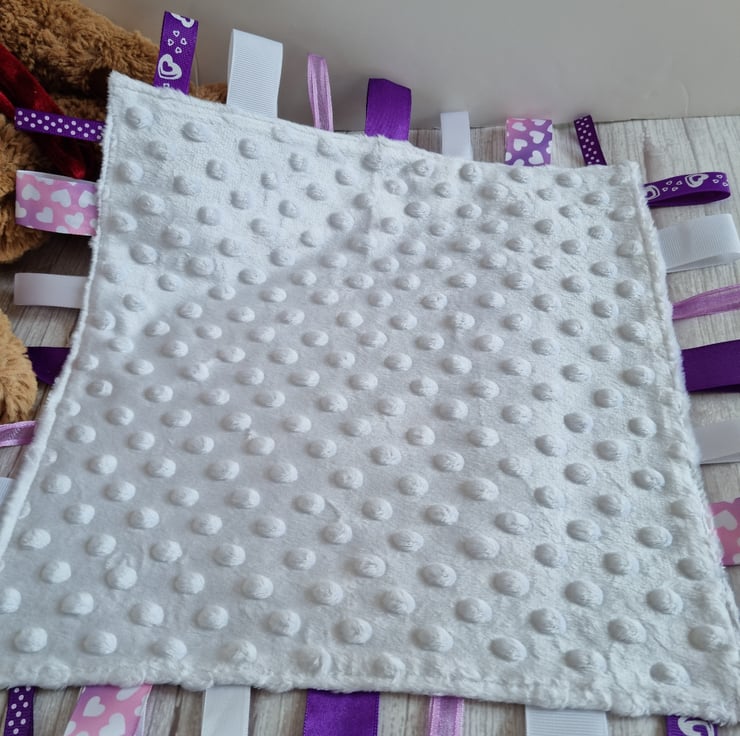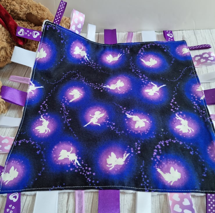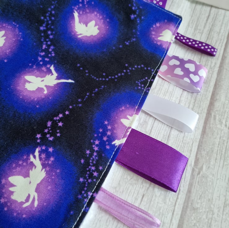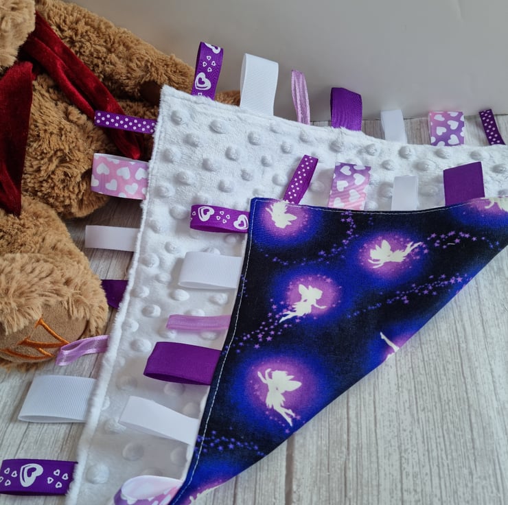 Deep purple and white glow-in-the-dark taggy blanket in a fairy print fabric which really does glow in the night light, with soft white dimpled fleece back and toning ribbons in shades of purple, lilac and white. Babies love exploring the different textured ribbons and the fleece back makes it super snuggly.