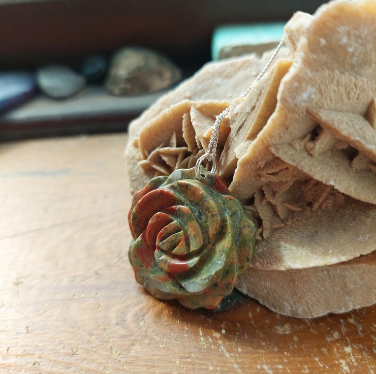 This is an impactful pendant, with the wonderful natural tones of greens and peachs. The detailed rose is 3cm in diameter. It hangs from a sterling silver ring 3.4cm and chain, which comes in a choice of 16,18 or 20 inches in length.