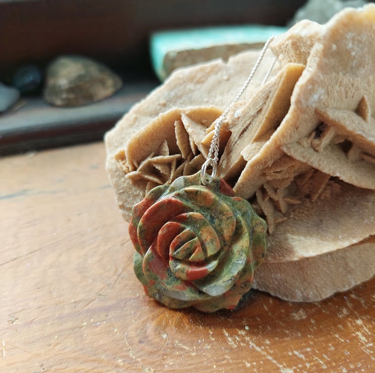 This is an impactful pendant, with the wonderful natural tones of greens and peachs. The detailed rose is 3cm in diameter. It hangs from a sterling silver ring 3.4cm and chain, which comes in a choice of 16,18 or 20 inches in length.