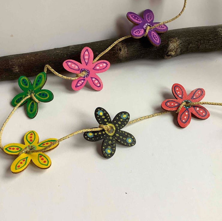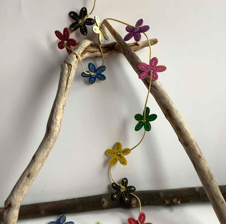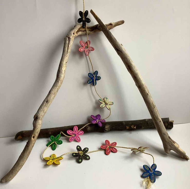 This multi coloured flower mobile is made up of 13/hand painted wooden flowers. A gold braid is threaded and secured through each flower with a loop tied at the top.