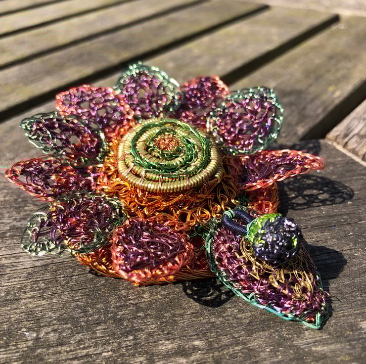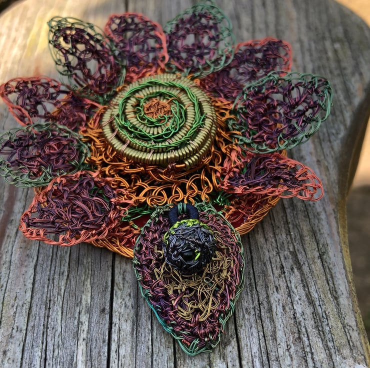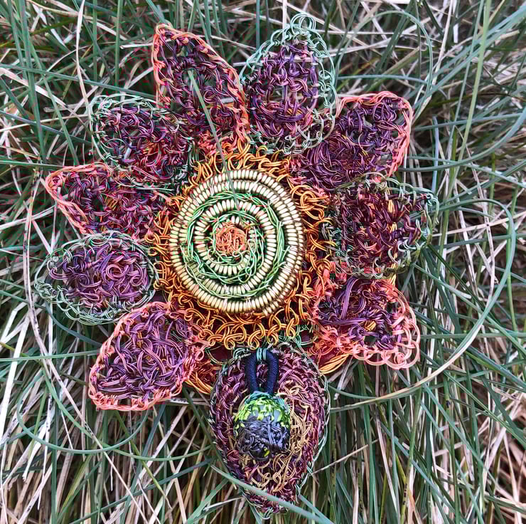 Petaled Brooch from recycled materials by Alison Bailey Smith in Wirral. Most of the wire has been recycled from old televisions including the beautiful purple and combined with repurposed red plastic from a conditioner bottle. I am a gardener and often flower forms appear in my pieces. It is 10cm x 8cm.
