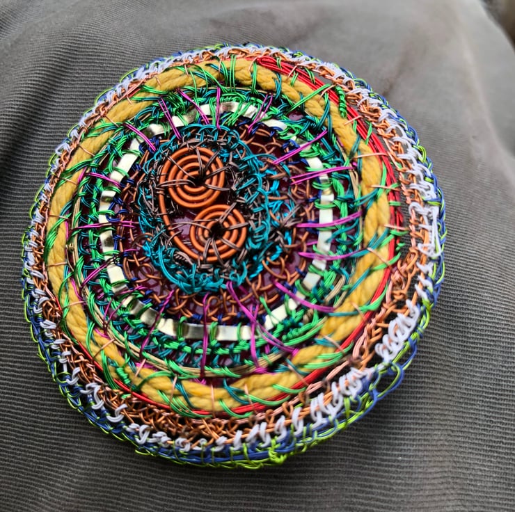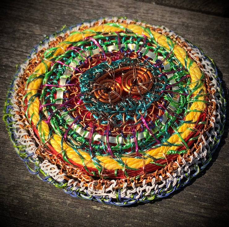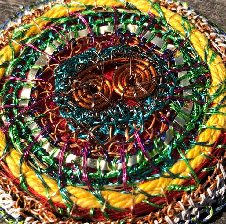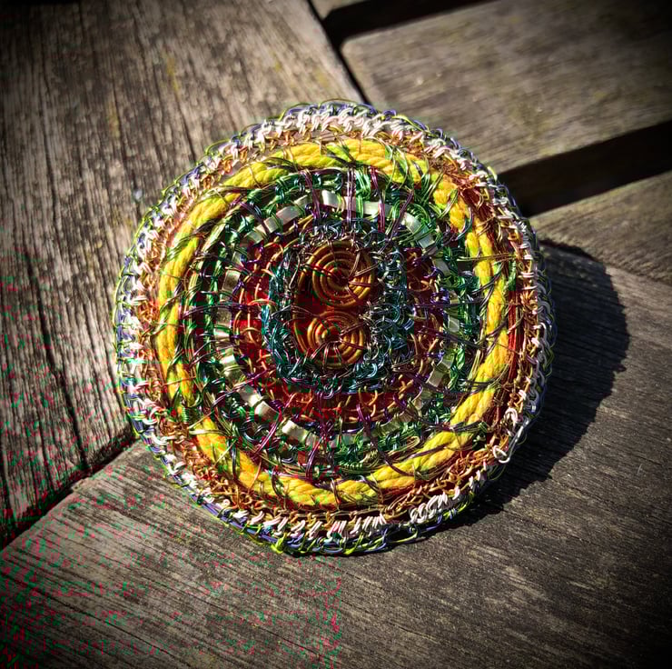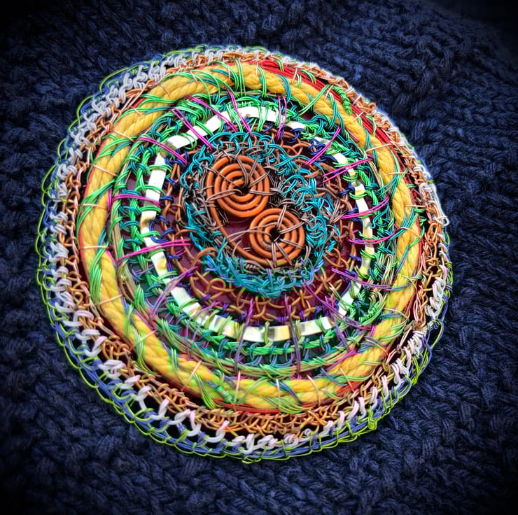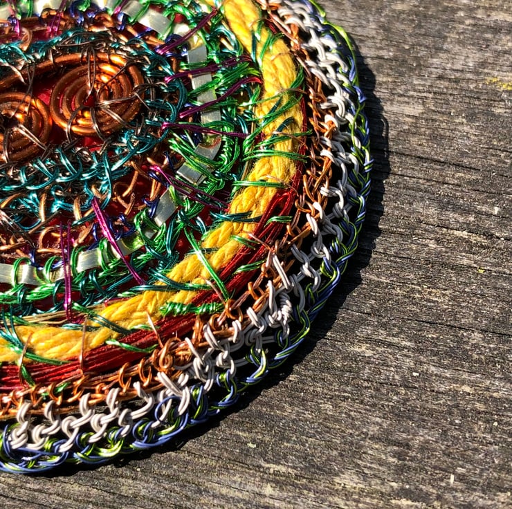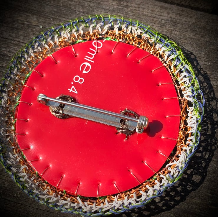 Flat disc brooch in yellow, copper, green made from recycled materials by Alison Bailey Smith in Wirral. Some of the wire has been recycled from old televisions and motors, combined with bought lacquered wire with metal reclaimed from tomato puree tube, yellow string from my Granny and backed with repurposed red plastic from packaging.