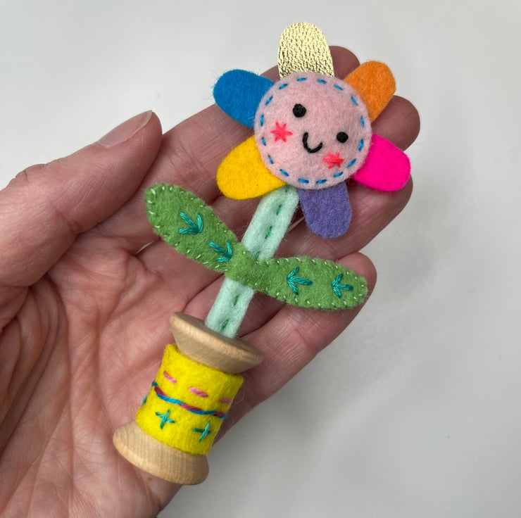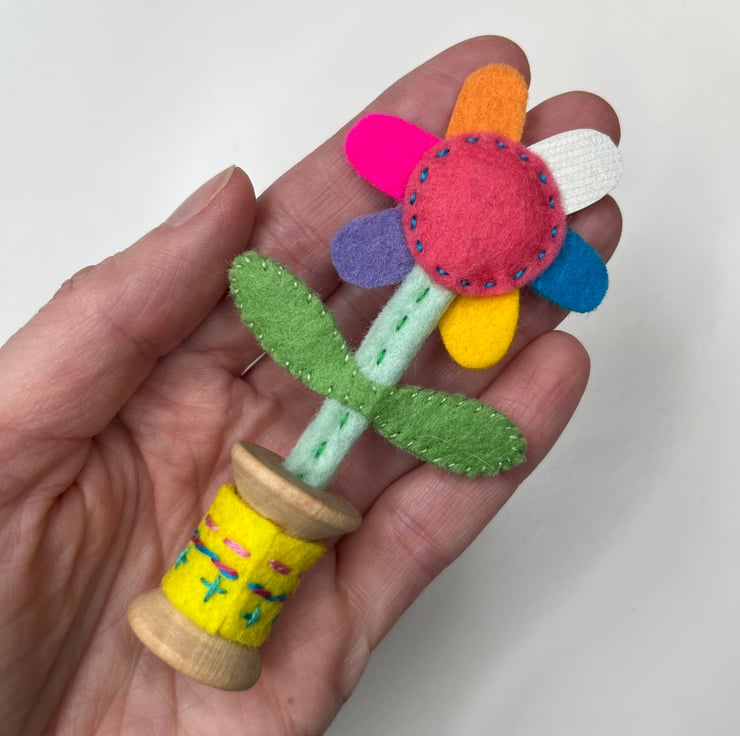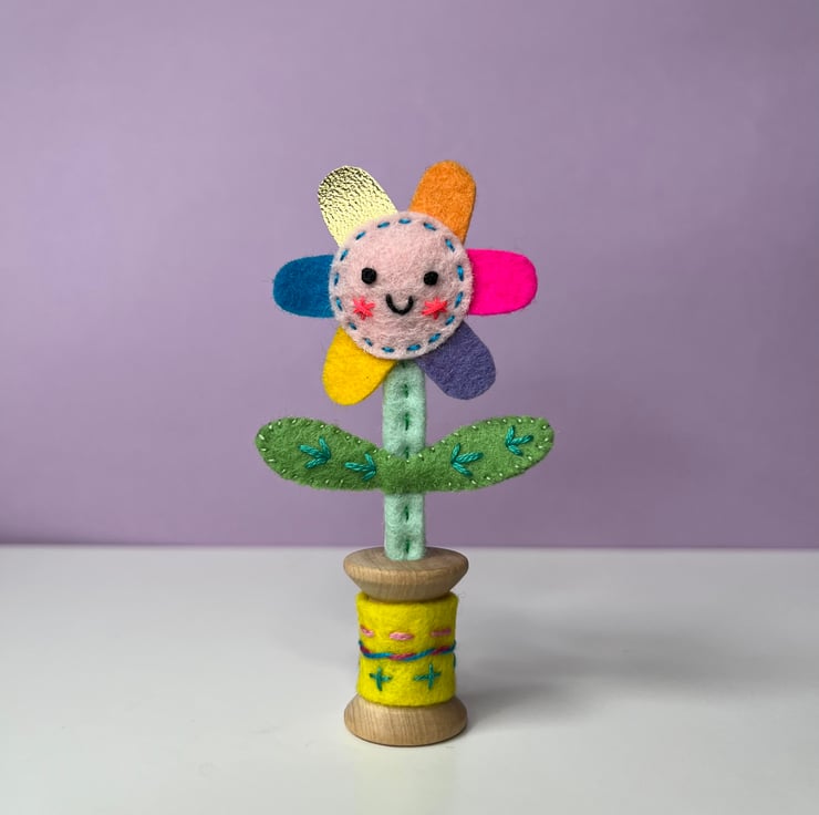 Each one is completely made by hand: the felt is all cut by hand, then embroidered and hand stitched into place. The flowers are then fixed into a small wooden bobbin with a dab of glue. The flower stalks are made from wire covered in wool felt, and hand stitched into place. A small amount of toy stuffing gives the flower’s smiling face shape. A shiny metallic sticker on the underneath covers the flower stalk. The wooden bobbin has a hand embroidered cover.