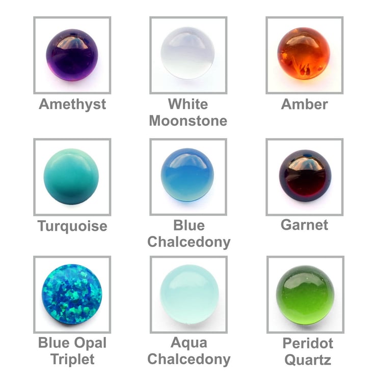 We offer a choice of gemstones which are Aqua Chalcedony, Turquoise, Blue Chalcedony, Garnet, White Moonstone Amethyst and lab. grown gemstones Blue Opal triplet and Peridot Quartz. Please select the stone of your choice from the drop-down menu above.