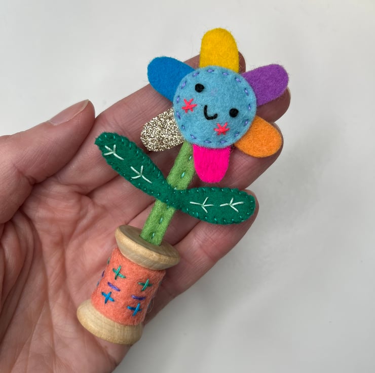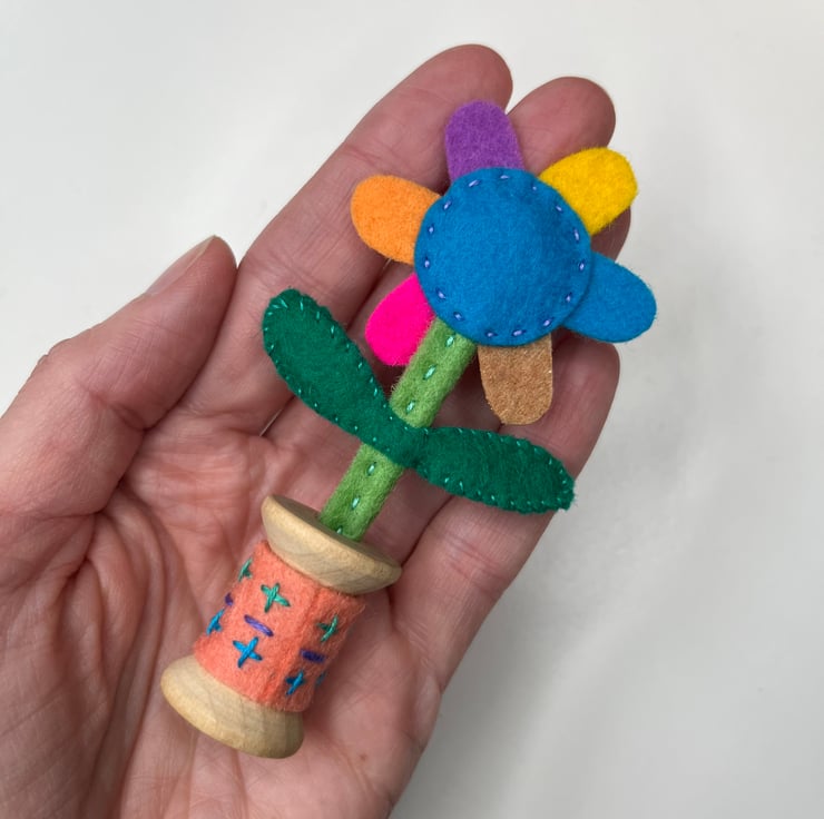 Each one is completely made by hand: the felt is all cut by hand, then embroidered and hand stitched into place. The flowers are then fixed into a small wooden bobbin with a dab of glue. The flower stalks are made from wire covered in wool felt, and hand stitched into place. A small amount of toy stuffing gives the flower’s smiling face shape. A shiny metallic sticker on the underneath covers the flower stalk. The wooden bobbin has a hand embroidered cover.