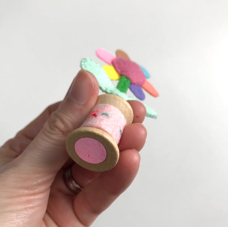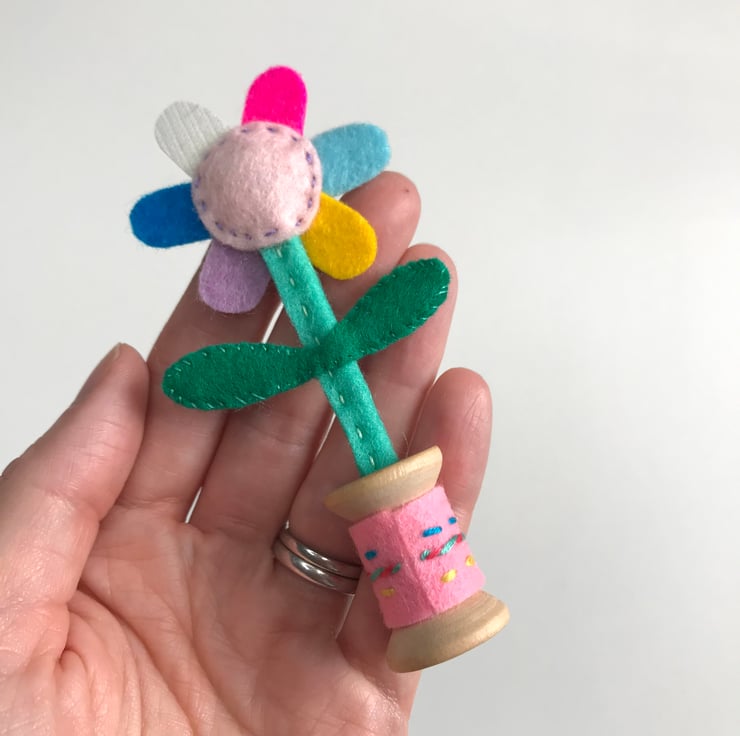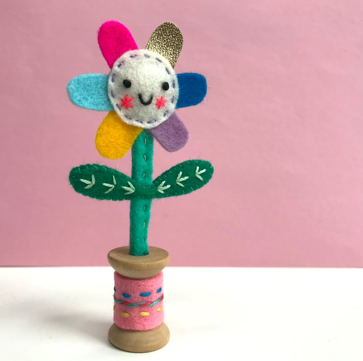 Each one is completely made by hand: the felt is all cut by hand, then embroidered and hand stitched into place. The flowers are then fixed into a small wooden bobbin with a dab of glue. The flower stalks are made from wire covered in wool felt, and hand stitched into place. A small amount of toy stuffing gives the flower’s smiling face shape. A shiny metallic sticker on the underneath covers the flower stalk. The wooden bobbin has a hand embroidered cover.