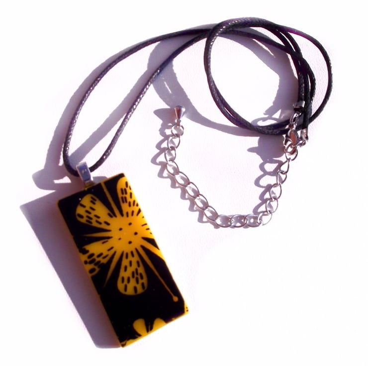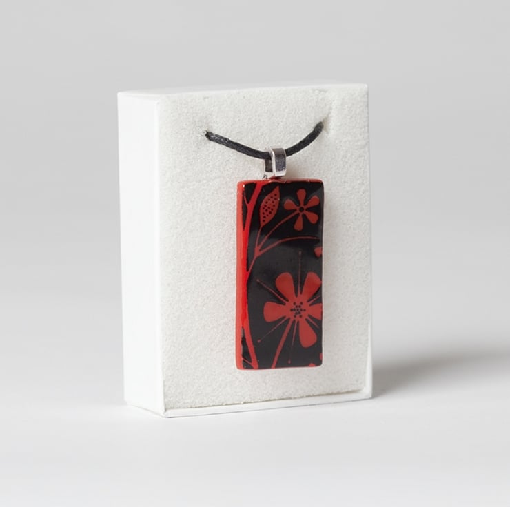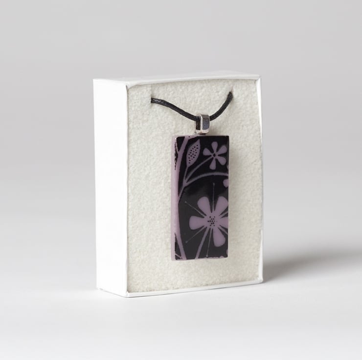 This pendant is handmade from coloured opaque glass which is screen-printed with black kiln-fired enamel, with this floral design. If you would like the flowers printed in white glass enamel, this listing can be found in the Pendant Collection in my shop.