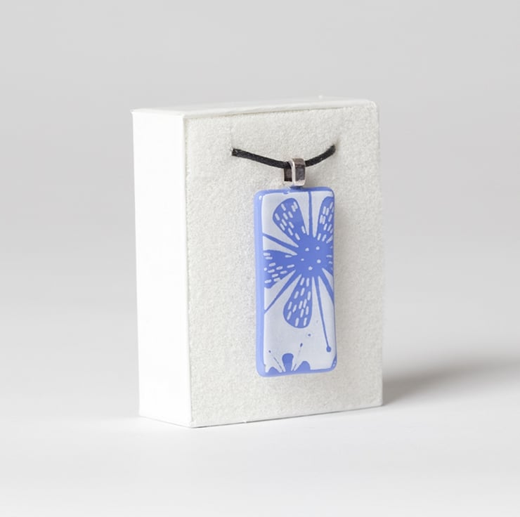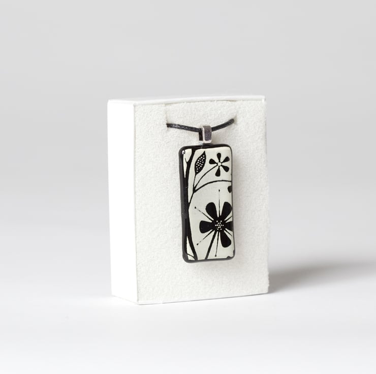 This pendant is handmade from coloured opaque glass which is screen-printed with white kiln-fired enamel, with this floral design. If you would like the flowers printed in black glass enamel, this listing can be found in the Pendant Collection in my shop.