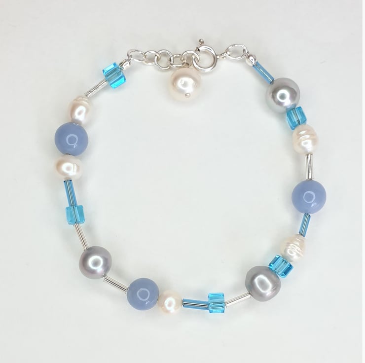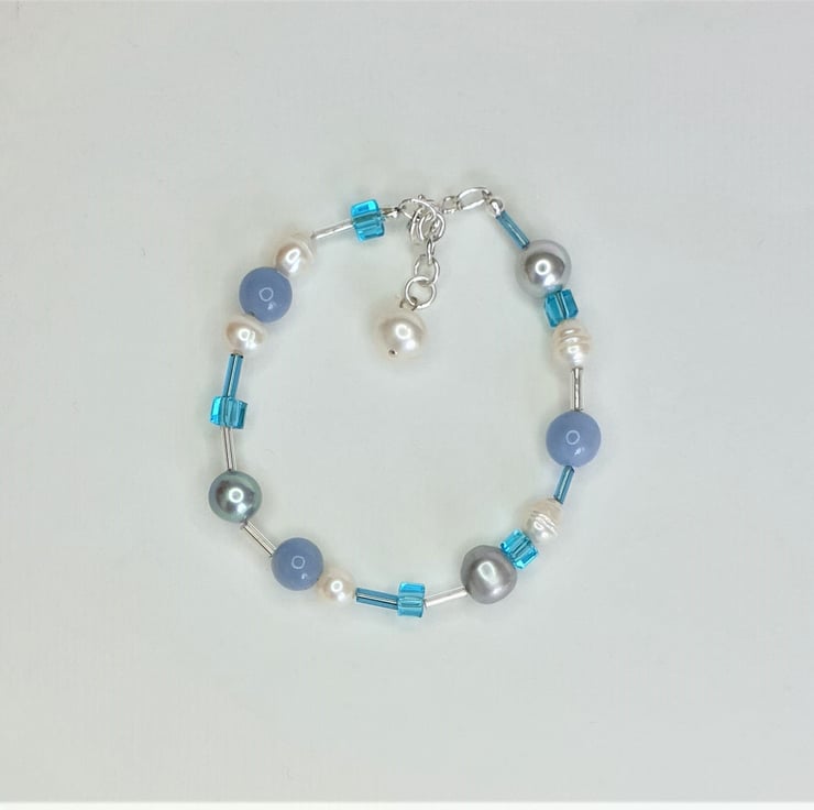 This Elegant Statement Bracelet is Handmade with Genuine White Freshwater Pearls, Silver Grey Shell Pearls, Angelite, Aqua Blue Faceted Czech Glass Cube Beads and 925 Sterling Silver. Perfect Gift for someone.