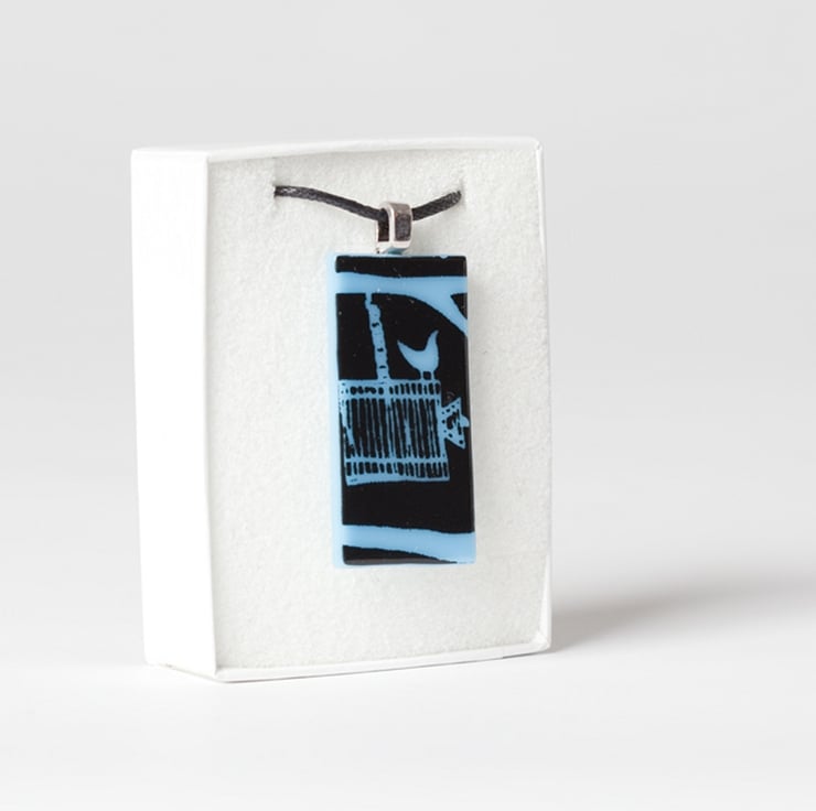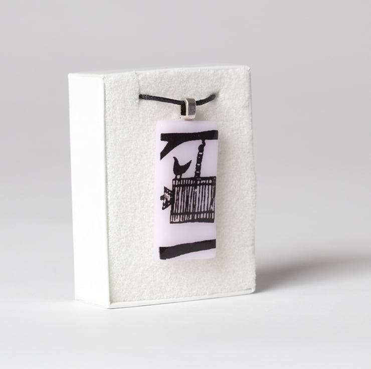 This pendant is handmade from coloured opaque glass which is screen-printed with black kiln-fired enamel, with this birdcage design. If you would like the artwork printed in white glass enamel, this listing can be found in the Pendant Collection in my shop.