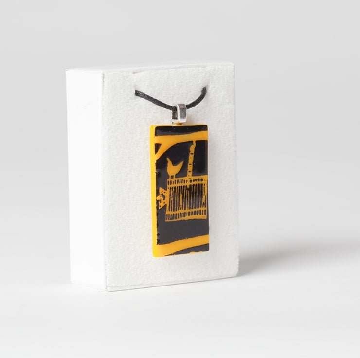 This pendant uses a stylised bird escaping it's cage design to create a simple one colour silhouette. I love trying out the screen-print on different glass colours as each one pops with the bright colour although this leads to the myriad of different colourways I can offer.