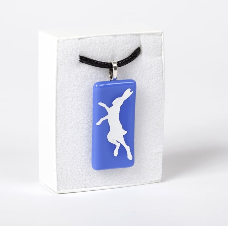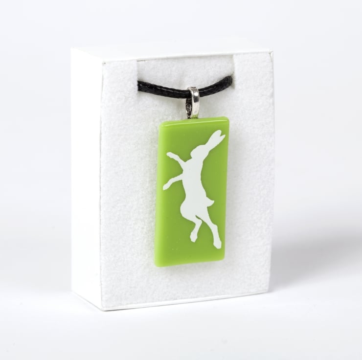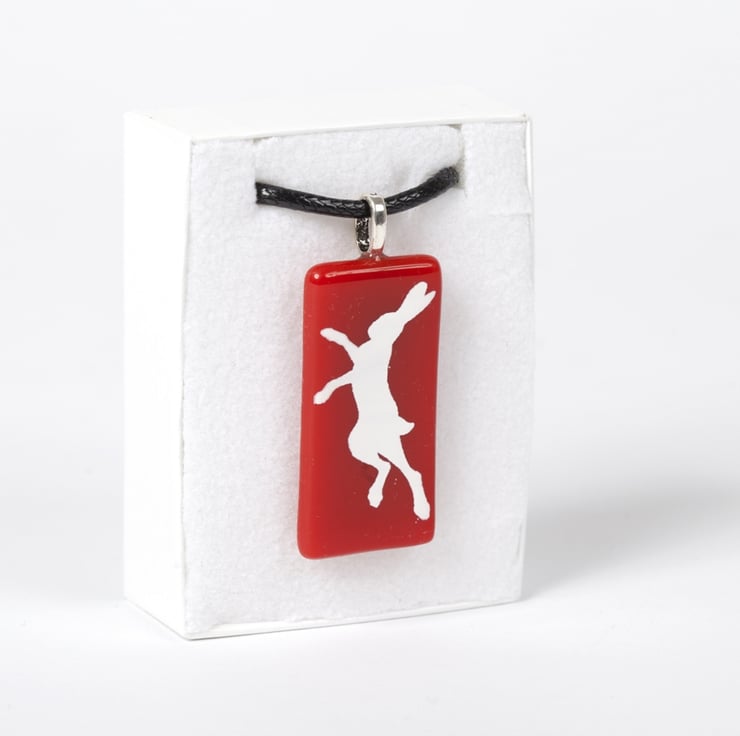 This pendant uses the original boxing hare silhouette from my large wall mounted glass sculpture except scaled down to pendant size and printed onto the bright coloured flat glass.