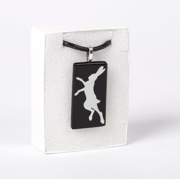 This boxing hare pendant is handmade from coloured opaque glass which is screen-printed with white kiln-fired enamel, with this hare design. If you would like the artwork printed in black glass enamel, this listing can be found in the Pendant Collection in my shop.