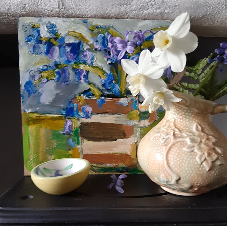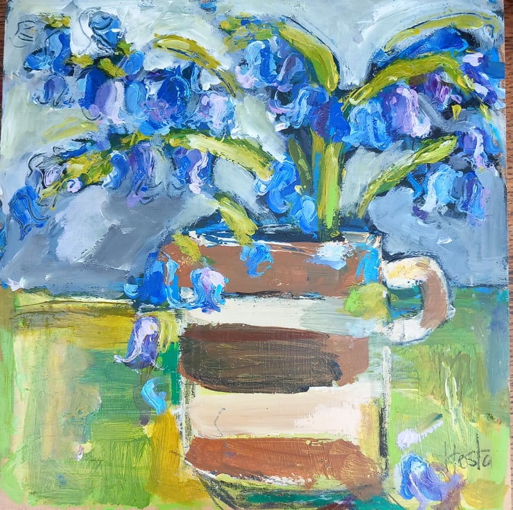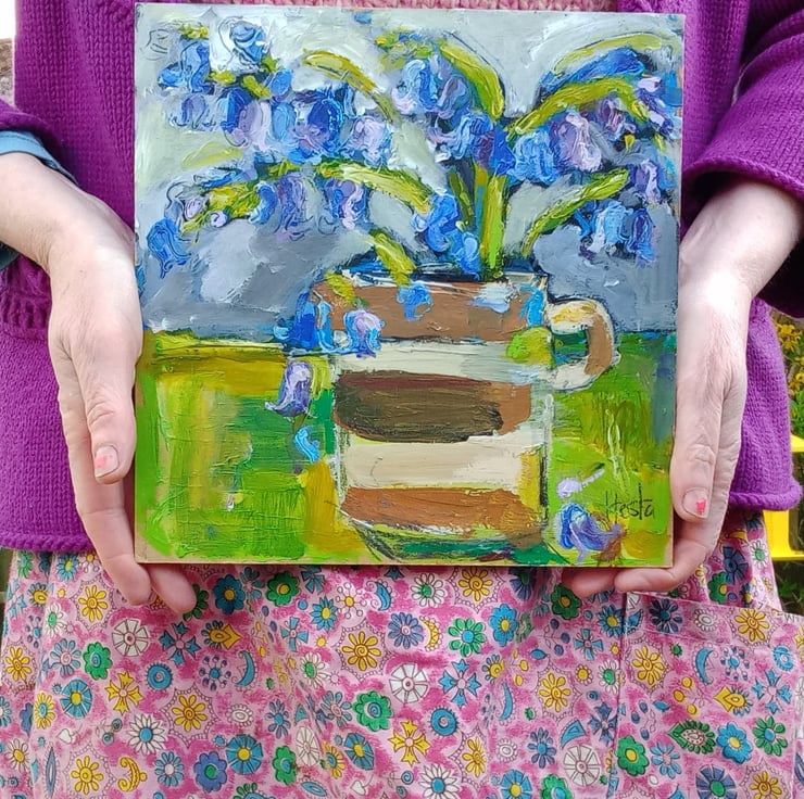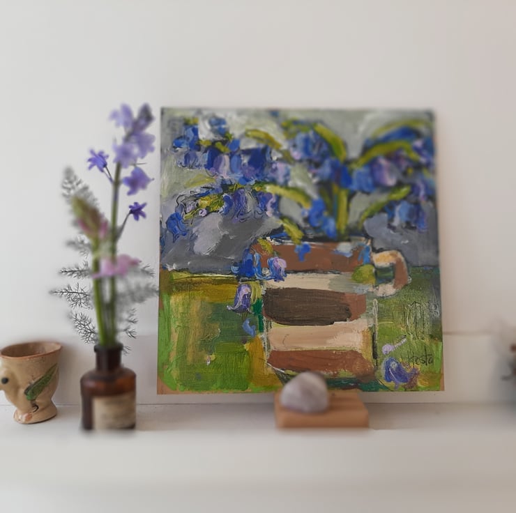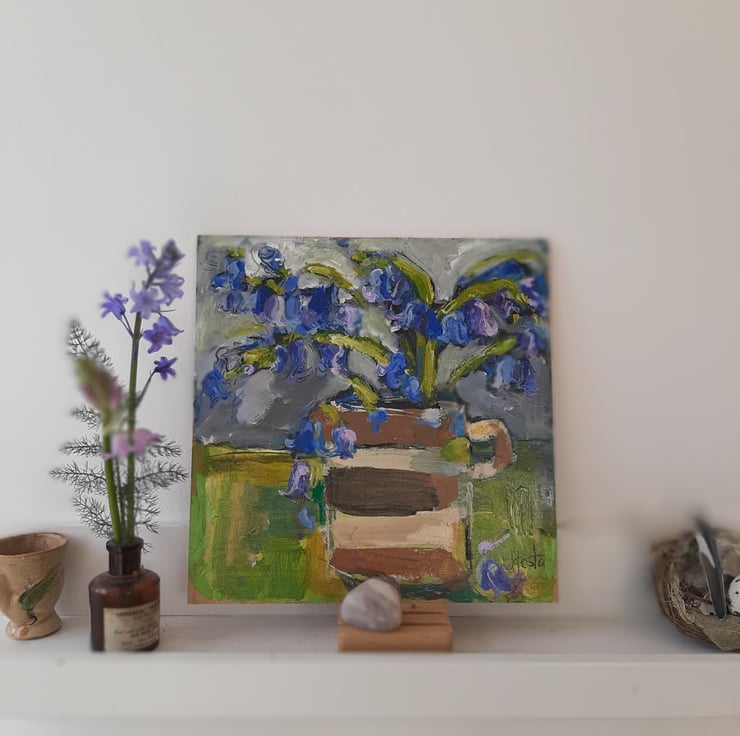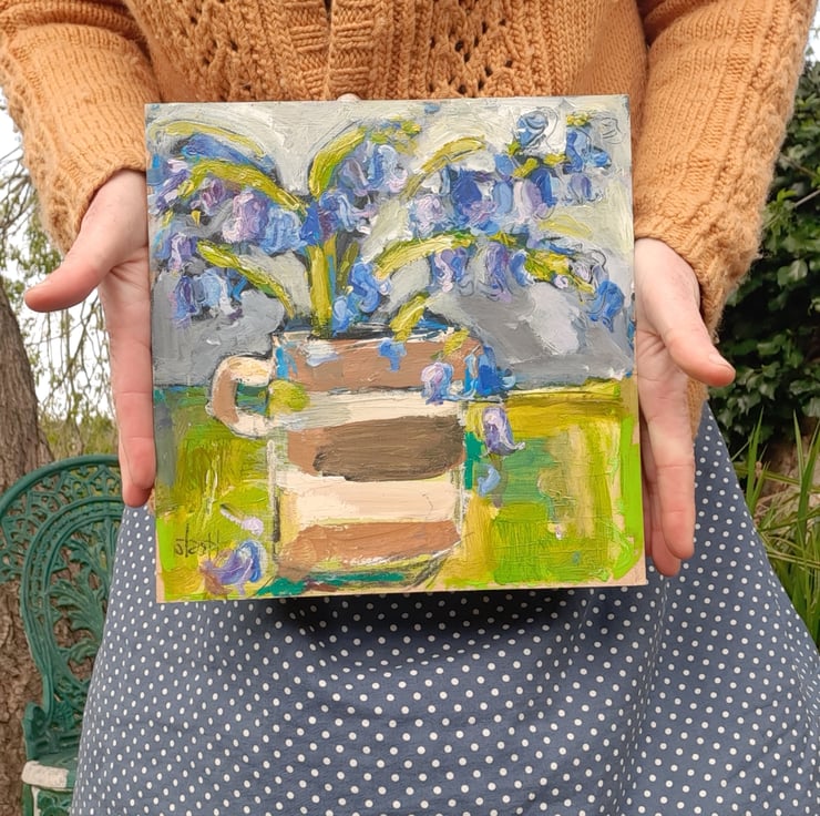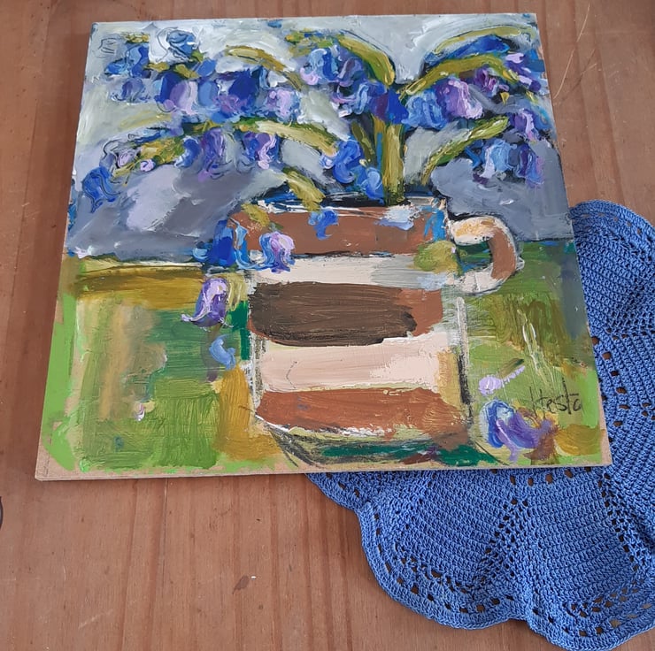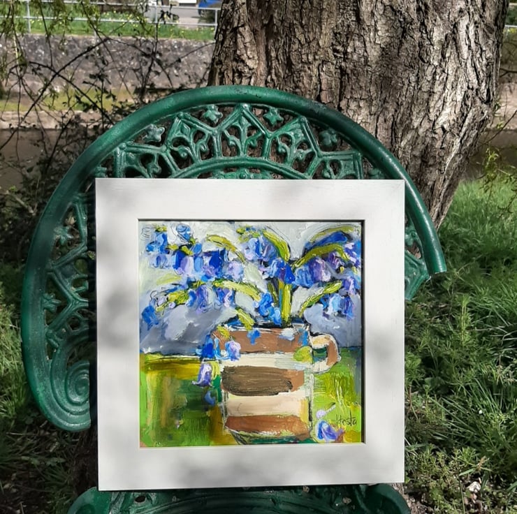 Celebrating the bluebells in this modern still life. loose open and with texture. I'm pleased with this beautiful painting on board. It would look beautiful in a white frame I have put a sample photo to show this. Measuring apox 22 cm square. Unframed