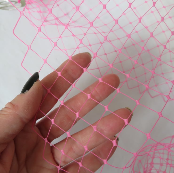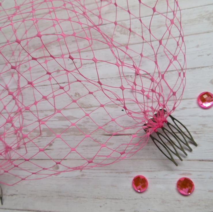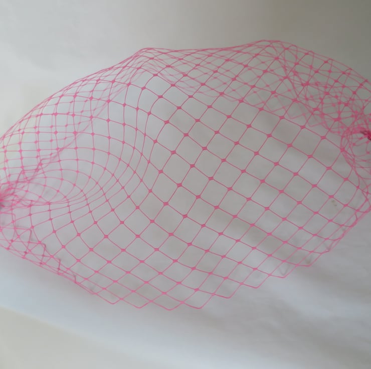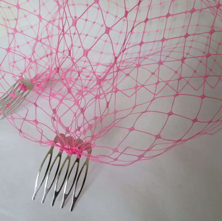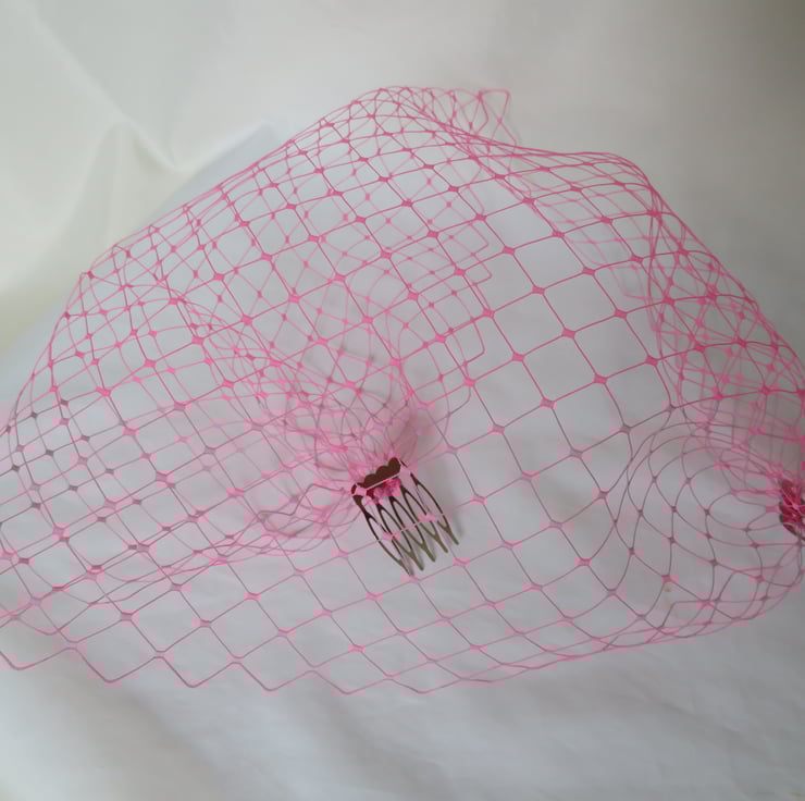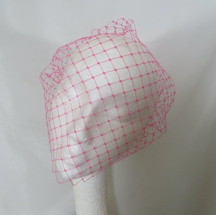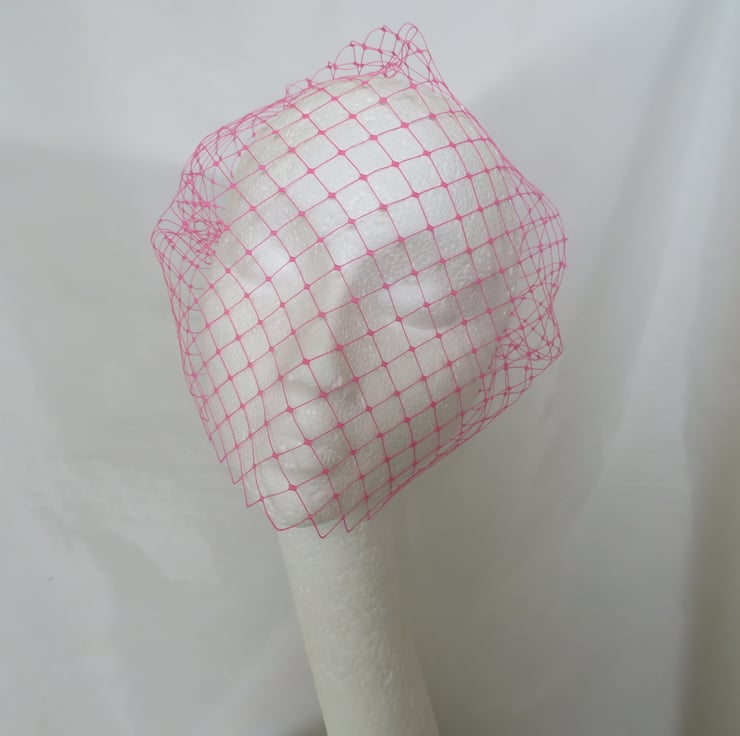 This is a bandeau birdcage style veil made from a rare English Merry widow veiling in a very bright fuchsia pink, it is quite stiff.