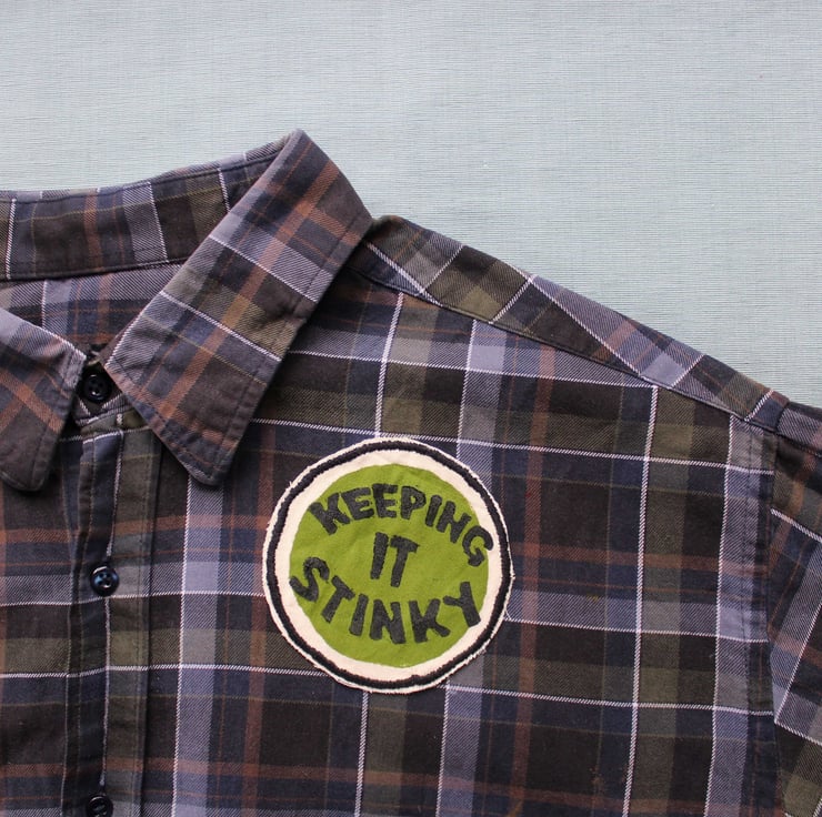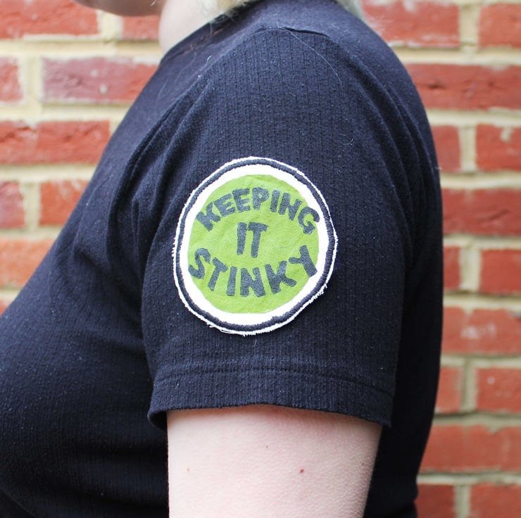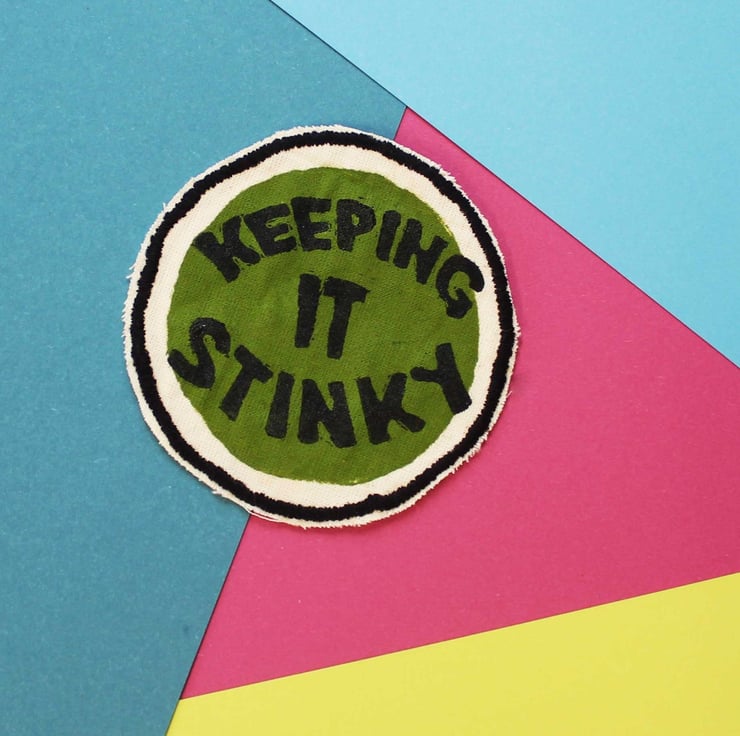 This is an original patch design that reads "Keeping it stinky" layered upon a green circle.