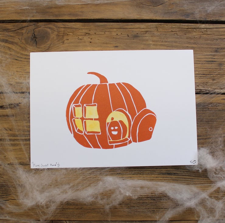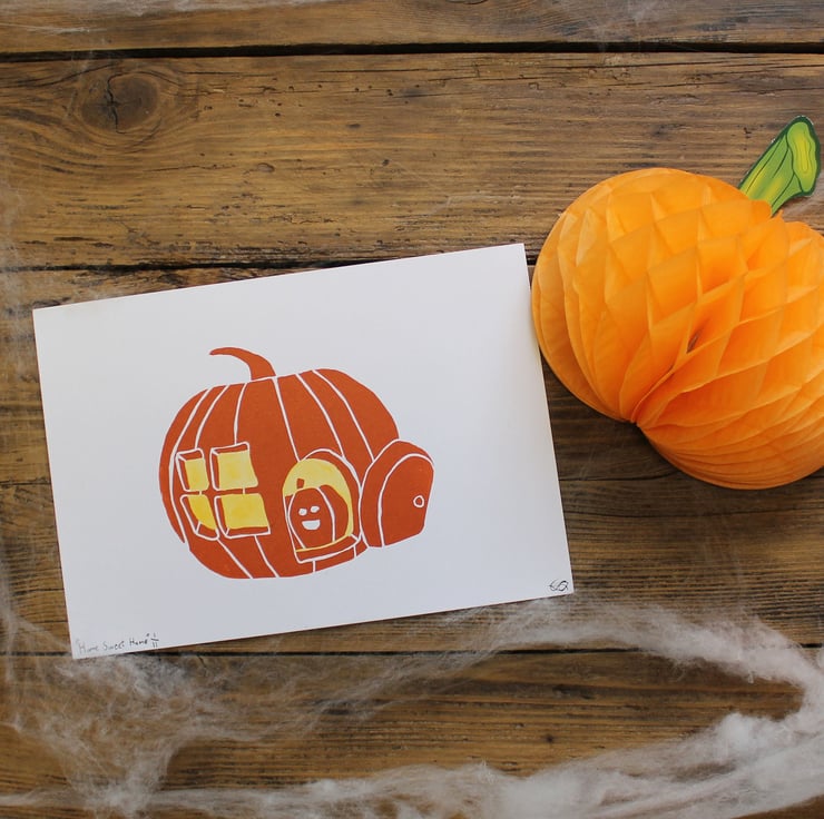 The image is a fun illustration of a tiny pumpkin in a tiny pumpkin house as part of my 2020 Halloween collection.