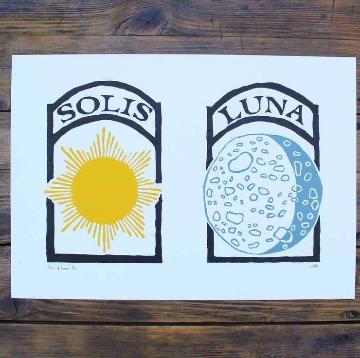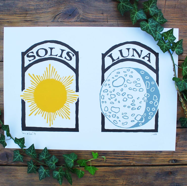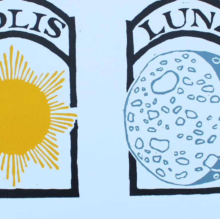 The image is a fun illustration inspired by Vintage moon & drawings with the word for moon & sun in Latin.