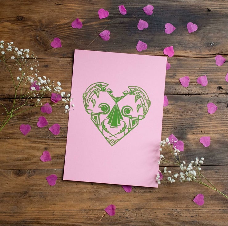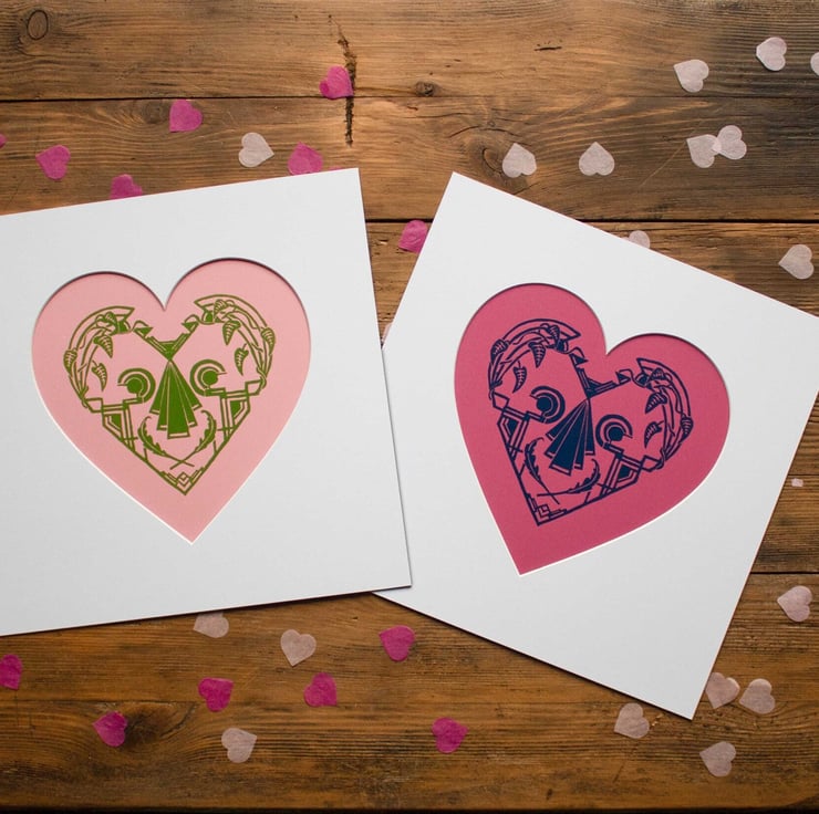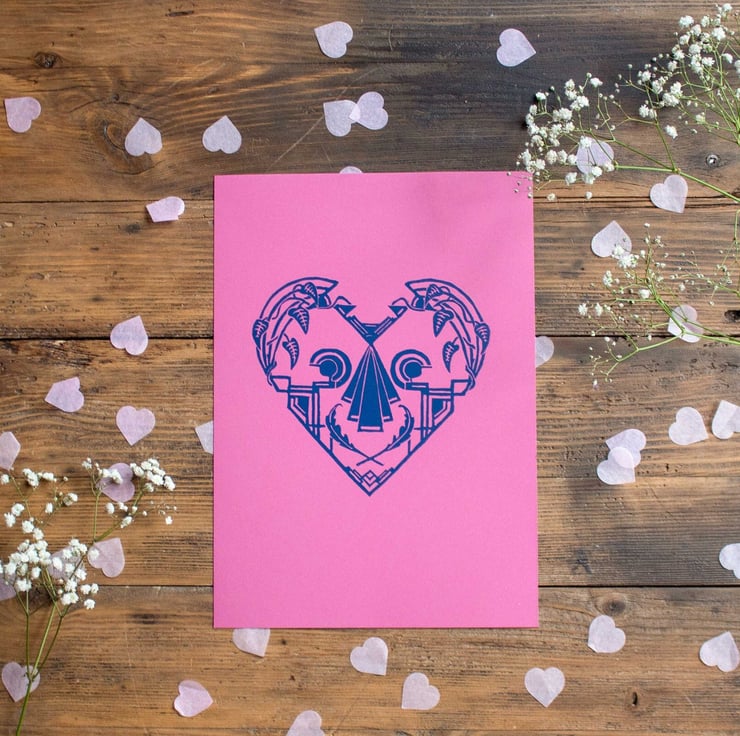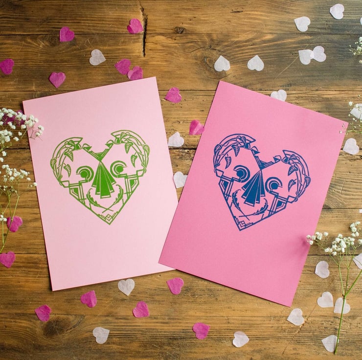 This Lino print is a beautiful heart-shaped design inspired by art deco stained glass. this design incorporates hard angles integrated with elements of nature printed in traditional linseed oil-based ink