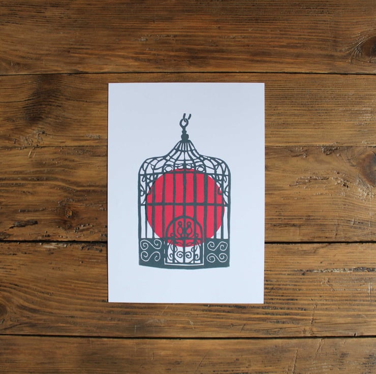 This is a high-quality original Linoprint artwork of grey birdcage with a pink circle in the middle.