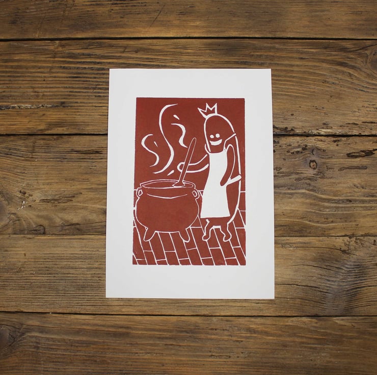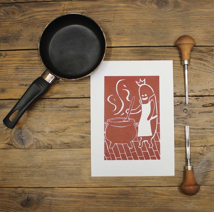 This is a high-quality original Linoprint artwork of a sausage wearing an apron cooking with a large pot and open flame.
