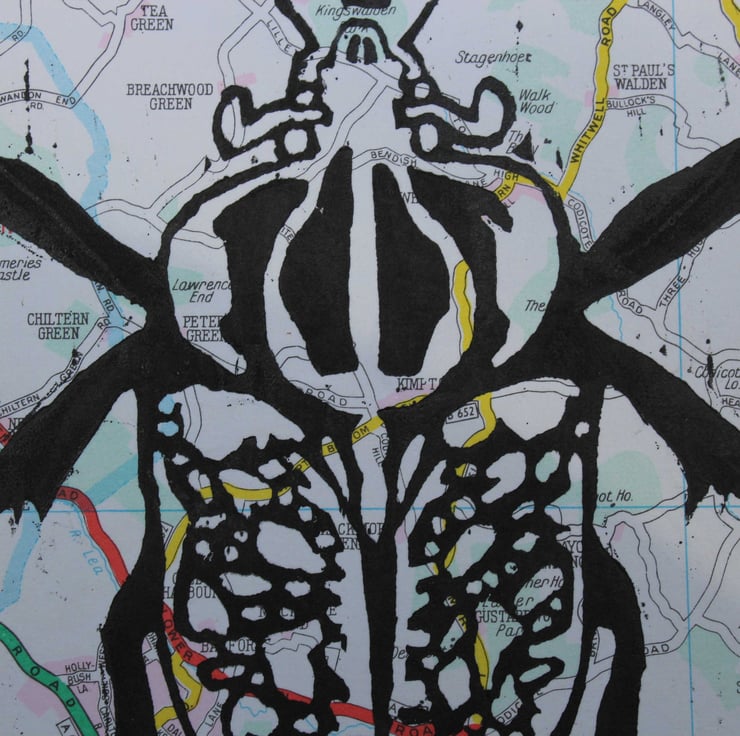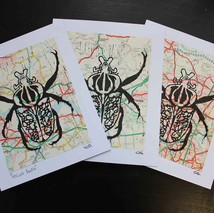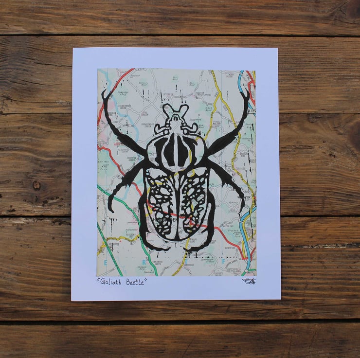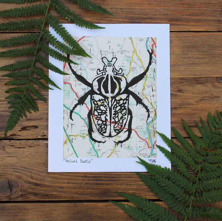 The image is a fun illustration of a Goliath Beatle printed on vintage maps.