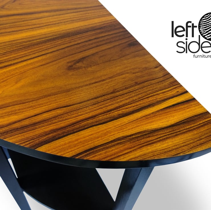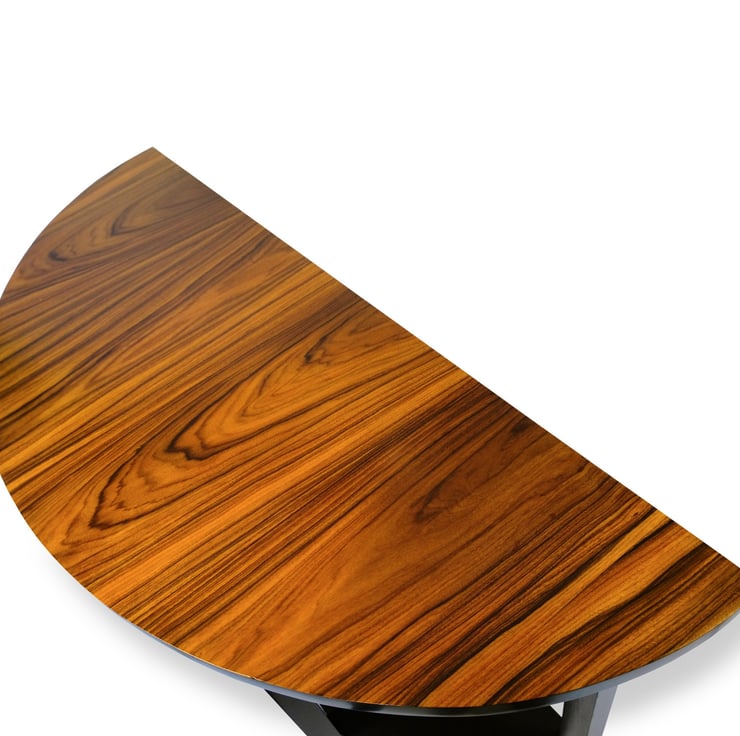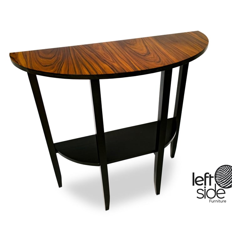 Hand made by me in my workshop this demi-lune table is veneered with stunning Rosewood and edge banded in black Tulipwood. The top is finished with multiple coats of satin lacquer to enhance the grain and protect the surface. The base is constructed using mortise & tenon joinery and professionally finished with black satin paint.