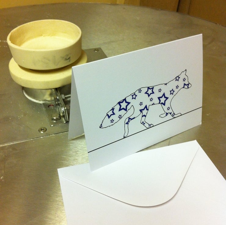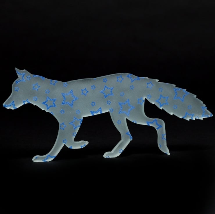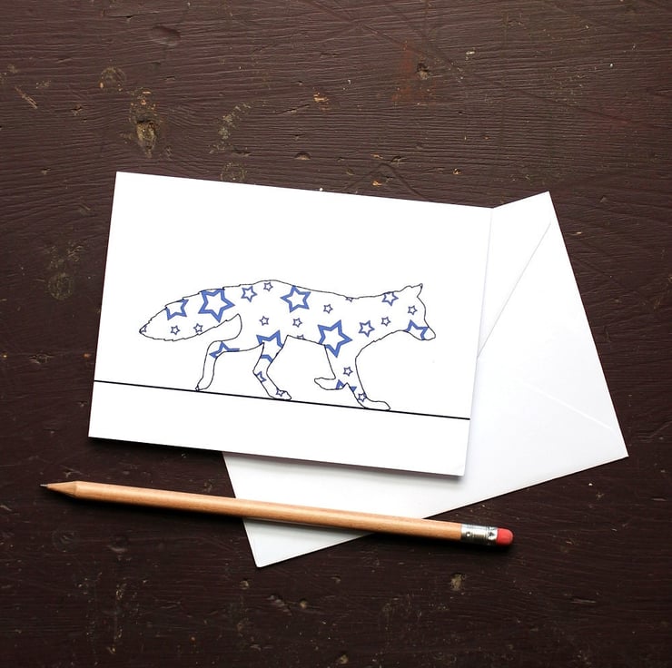 This Starry Fox greetings card is taken from the original glass design that had a smattering of blue stars printed across it.