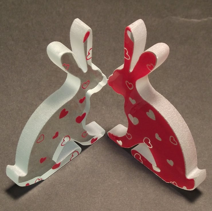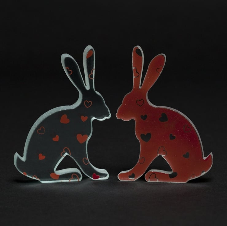 When I first played about with the hare cut outs in glass, I was really inspired by standing them facing each other and making shapes with multiples so adding a flurry of love hearts over a pair of love bunnies just seemed like the obvious next step!