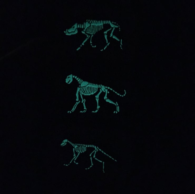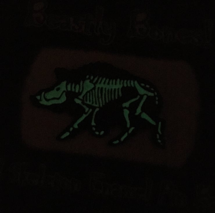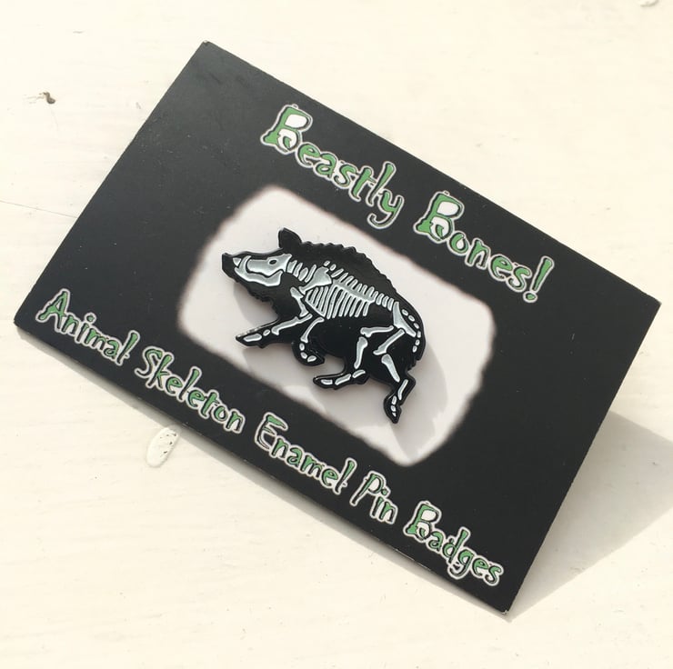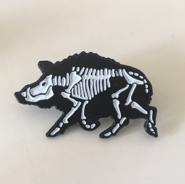 X-Ray Wild Boar Skeletons feature on these soft enamel pin badges, made in black nickel-free plated metal with a glow in the dark white fill for the bones!