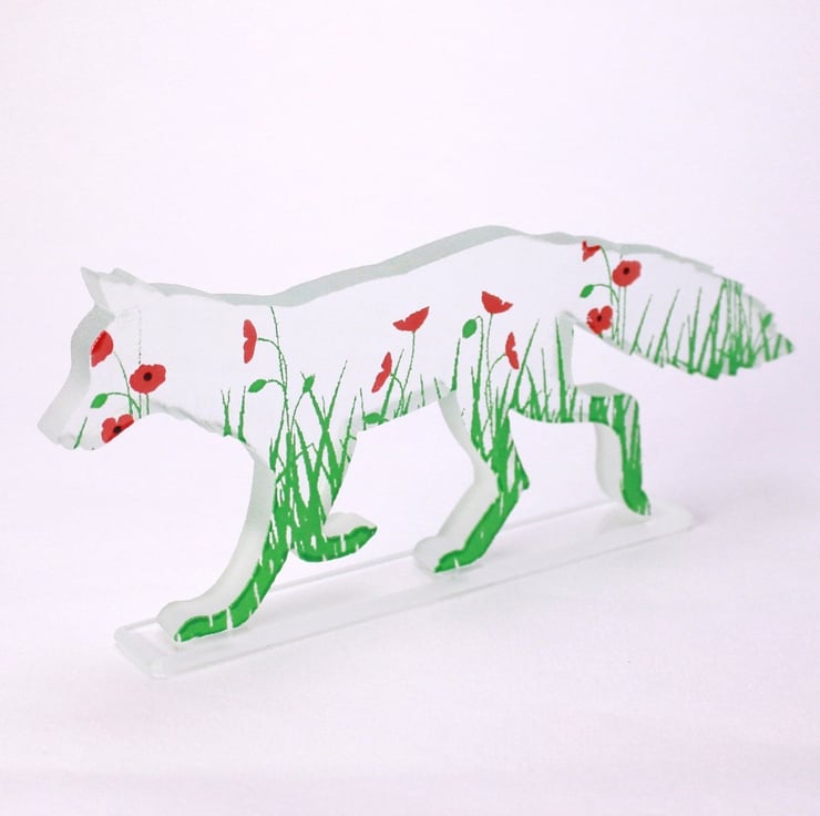 This Poppy Fox greetings card is taken from the original glass design that had field of red poppies printed across it.