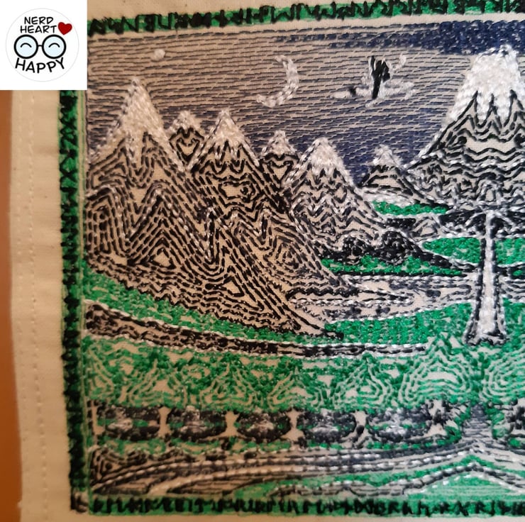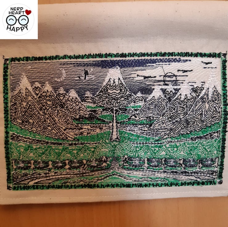 Handmade embroidered wall hanging of the original cover for JRR Tolkein's The Hobbit.