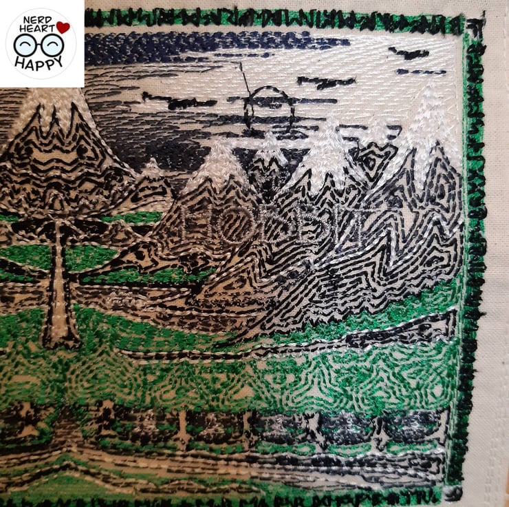 Stitched in grey, white, black and green thread on a natural cotton canvas background, a wooden rod and ends and polyester cording.