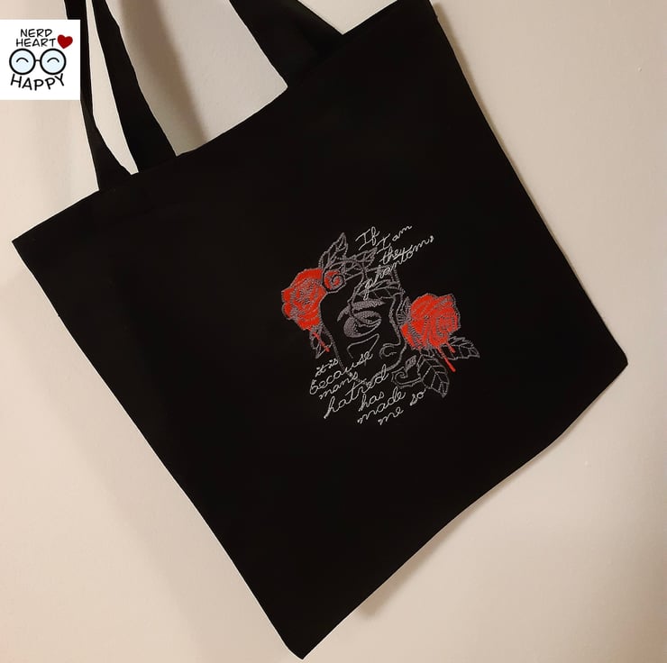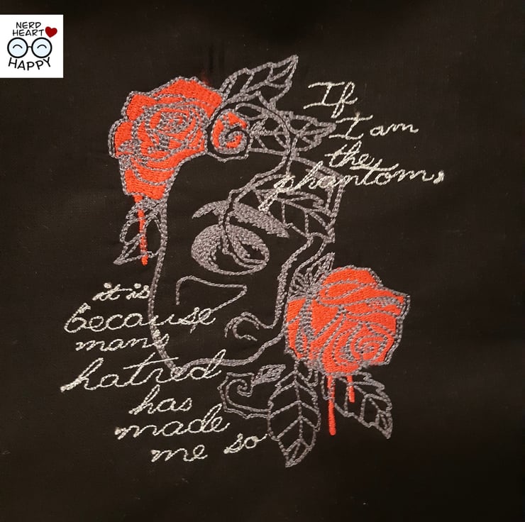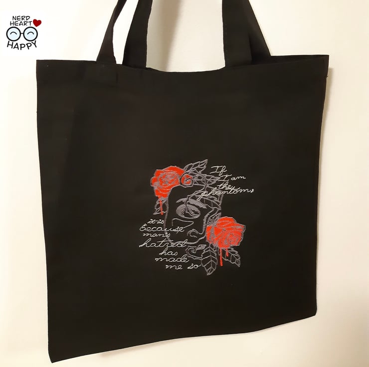 This bag features a quote from Gaston Leroux's gothic horror novel 'The Phantom of the Opera'; 'If I am the phantom, it is because man's hatred has made me so'.