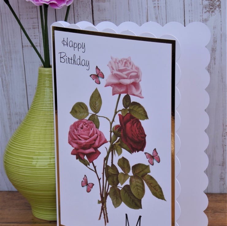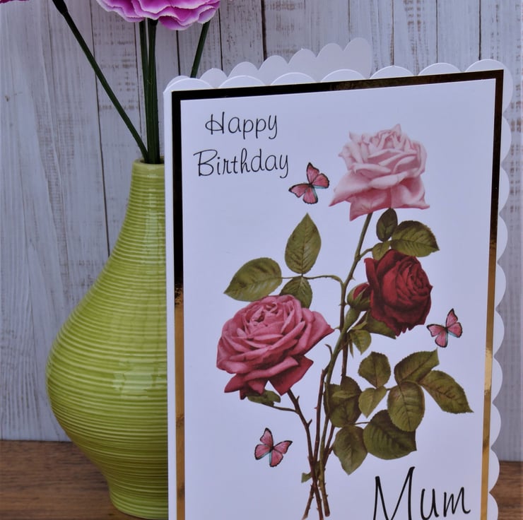 This birthday card for Mum is made from 300gsm white scalloped card. Image of flowers and butterflies, layered onto gold mirri card to frame. Added a sentiment to complete.
