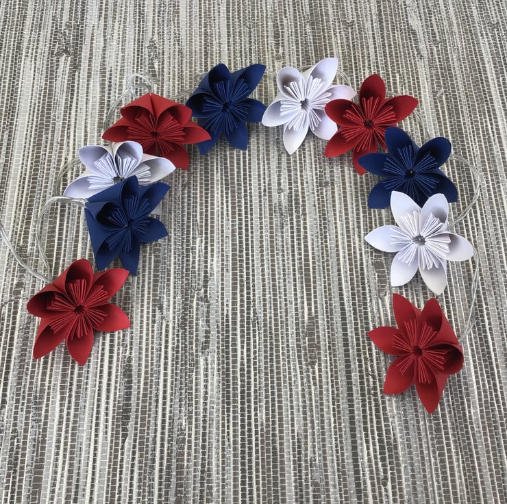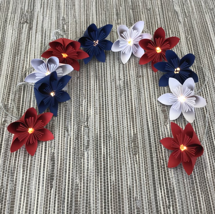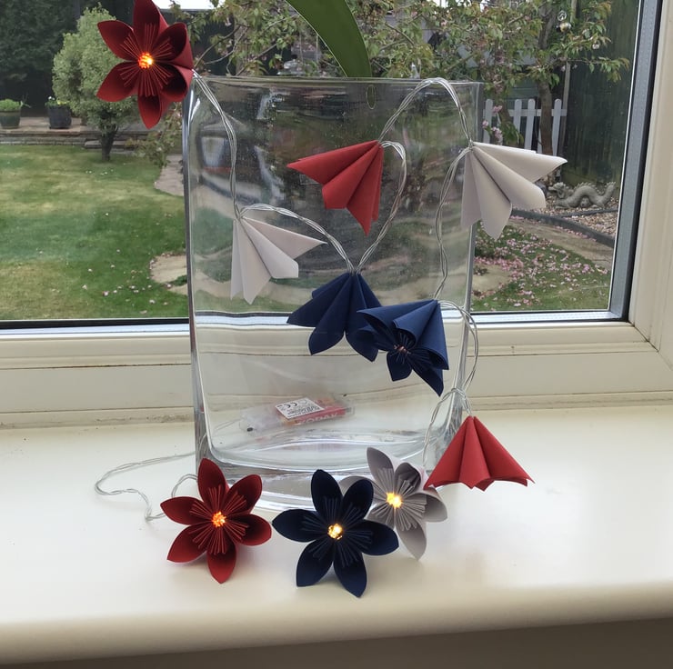 There are 10 paper flowers in total, each measuring approx 7cm across and 5cm depth and all have been carefully folded and assembled around each of the ten lights.