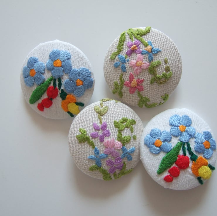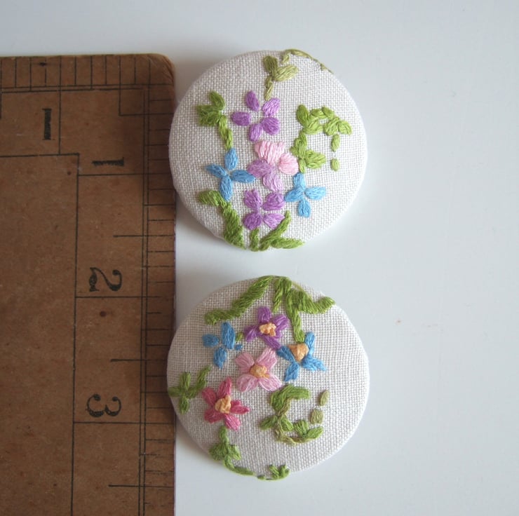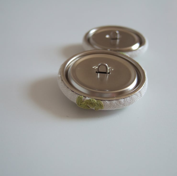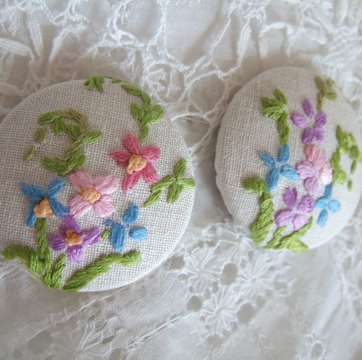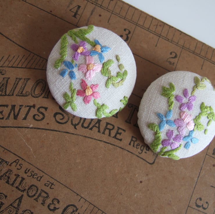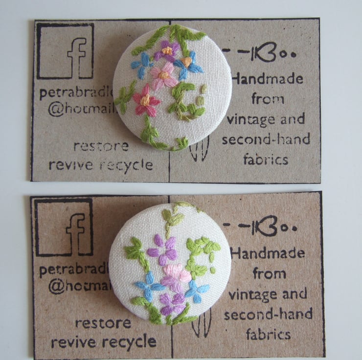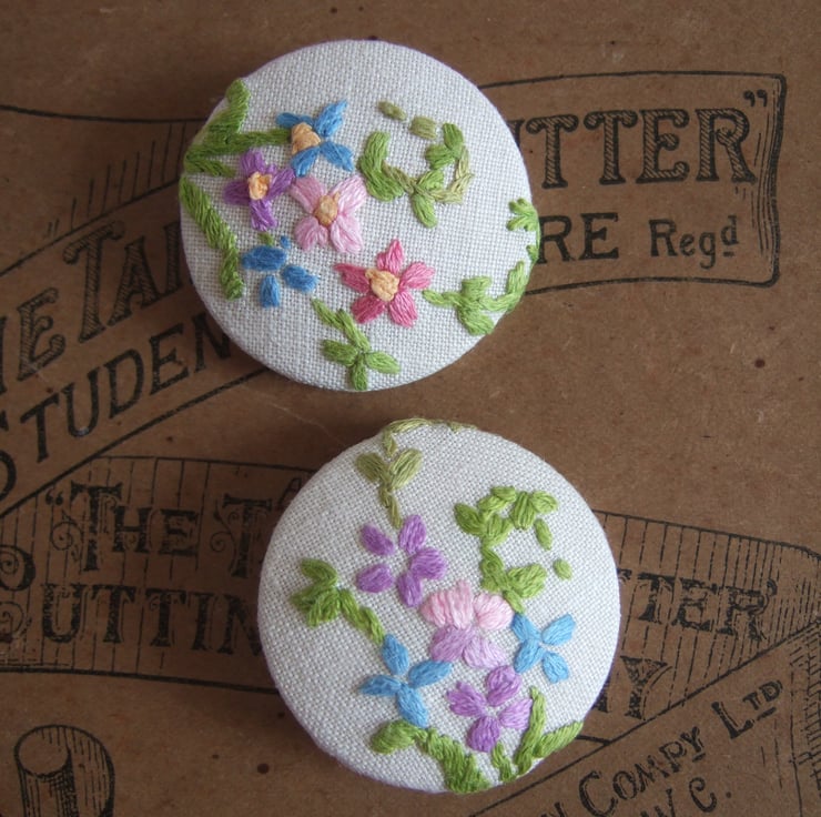 These extra- large metal buttons are covered with a sprig of springtime flowers, each from a tiny fragment of an old embroidered traycloth, now rescued, and made into something pretty and practical once again.