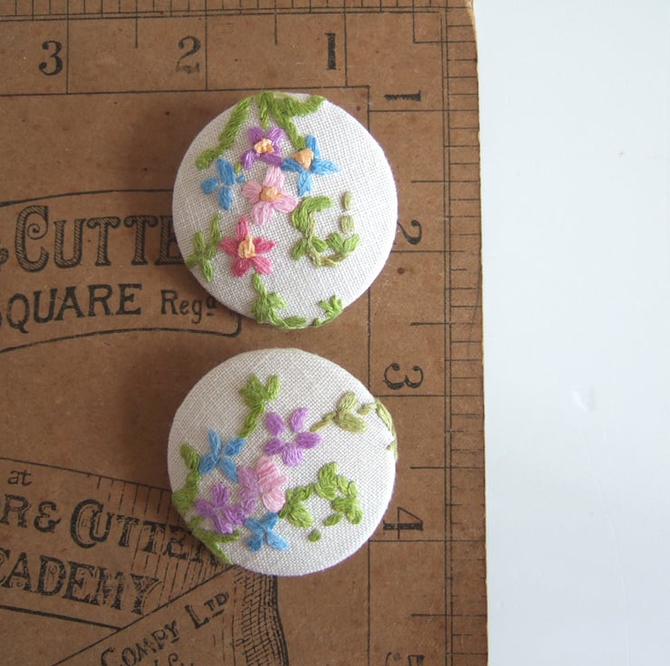 I like to collect vintage embroideries, but often they have seen better days. Even so, I can’t bear to throw them away. Covering buttons is my way of using the tiny, perfect, leftover fragments from those threadbare pieces. There is a pair of bright buttons also in my shop right now.