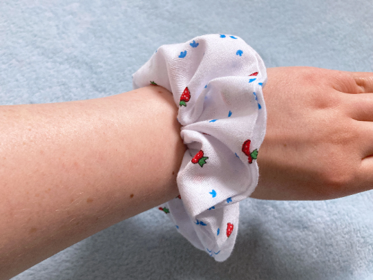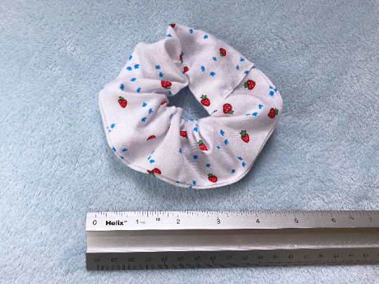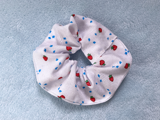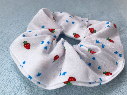 Large, handmade scrunchy in white, patterned with adorable tiny strawberries.