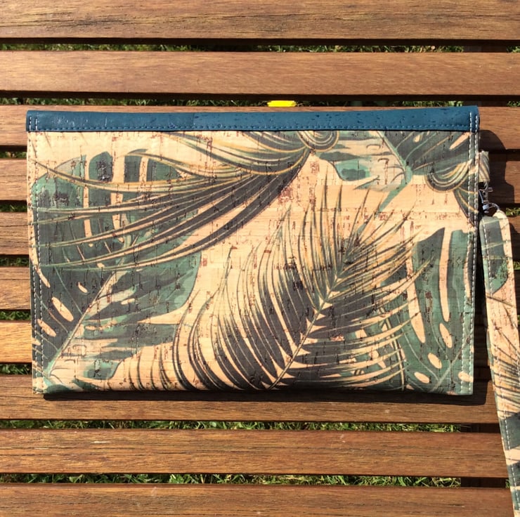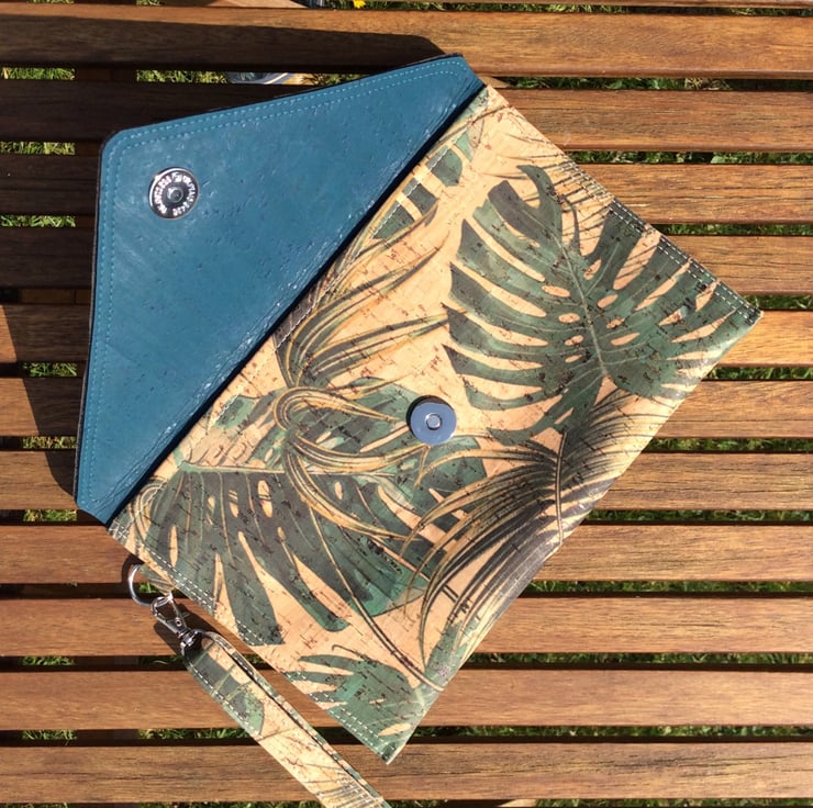 Slim and lightweight this elegant little handbag is perfect for summer parties, weddings and evenings. It is made from natural cork fabric with a jungle leaves print and has a contrasting dark green flap. It comes with a detachable wrist strap, has a magnetic clasp and is lined with cotton batik print fabric .