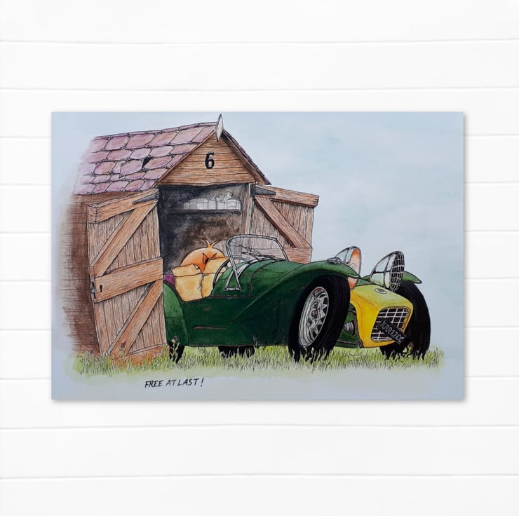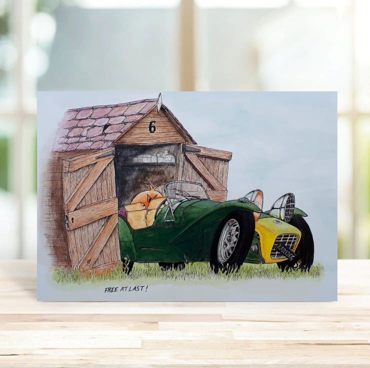 An original art greetings card with a quirky take on a classic car - ideal for lovers of great British cars.