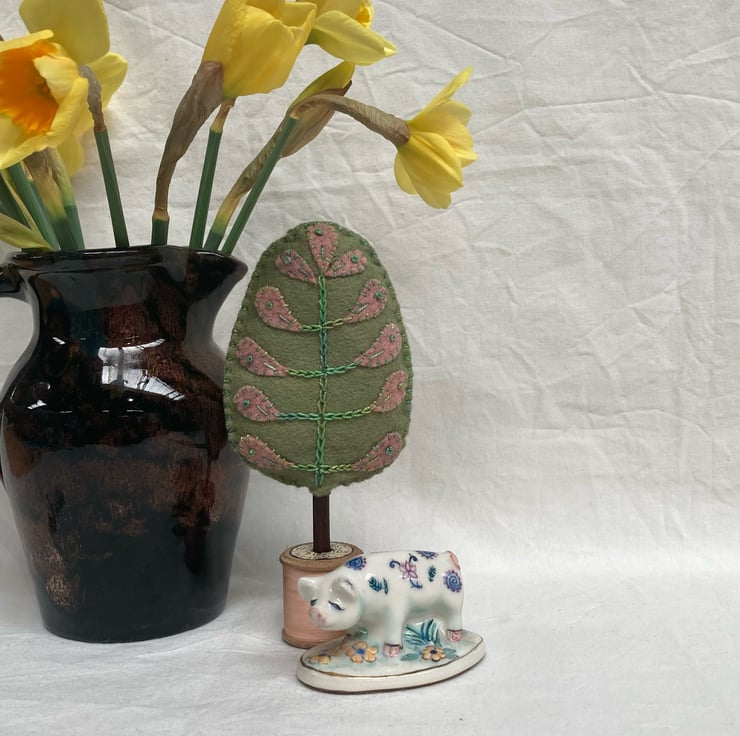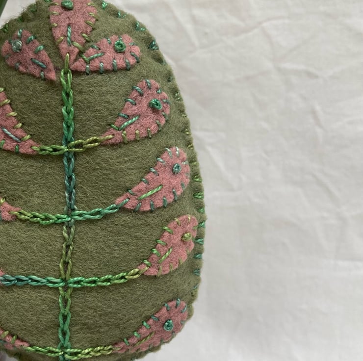 My own design, everyone is different and quirky. Hand stitched with felt leaves and variegated pearle thread.