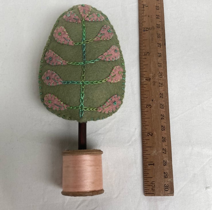 A cute little hand made tree, standing proudly on a vintage cotton reel.