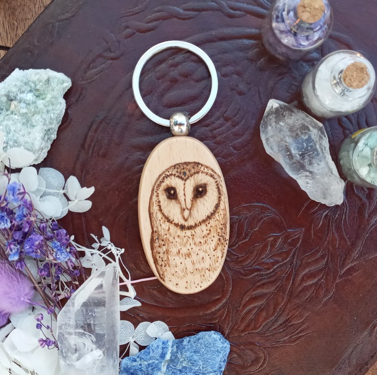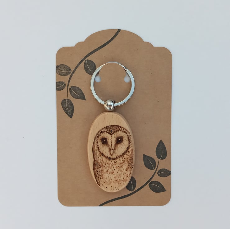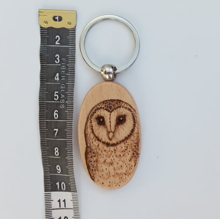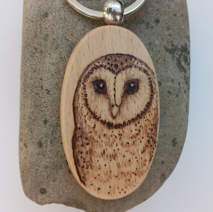This barn owl has been burned onto beech wood using the technique of pyrography. It's 3.5cm x 6cm in size. It's sealed with artists varnish.