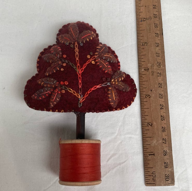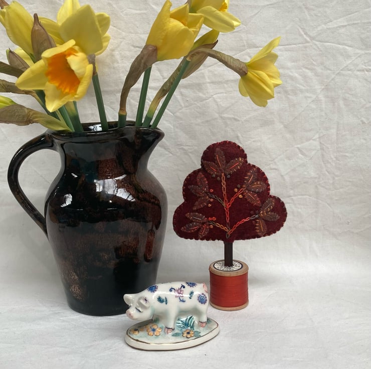 My own design, everyone is different and quirky. Hand stitched with felt leaves and variegated pearle thread.