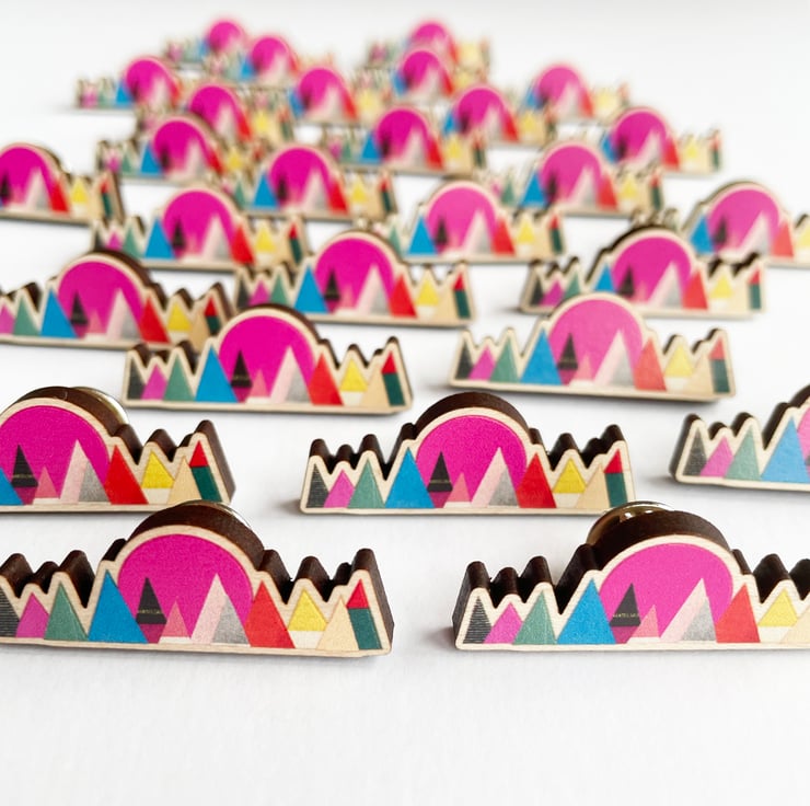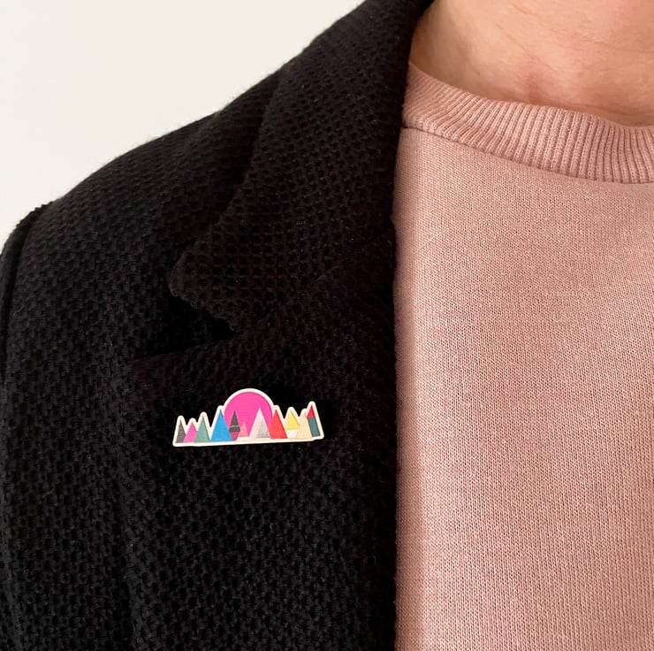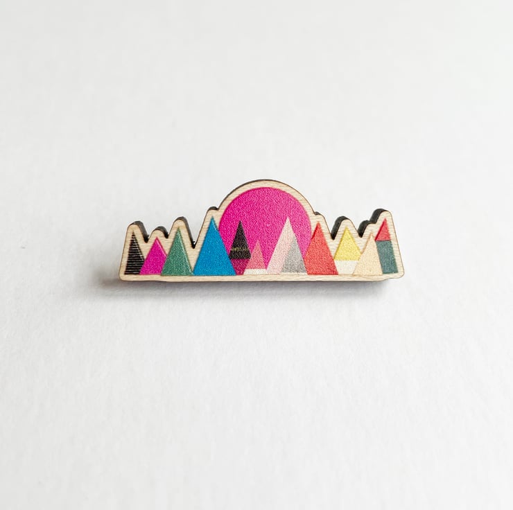 A beautiful mountain brooch with a hot pink setting sun, ready to liven up your top or coat.