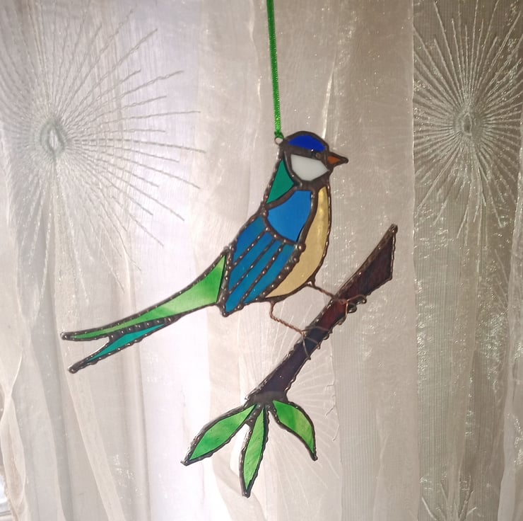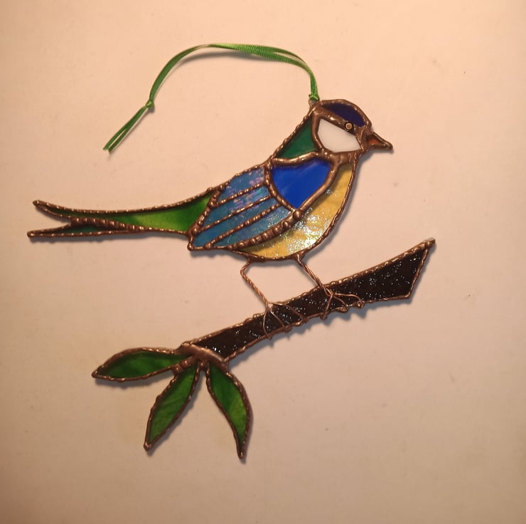 A beautiful little stained glass blue tit made using dark and iridescent blue, green and yellow glass perching on a mottled brown branch with green leaves. The perfect gift for bird lovers, looks great hanging in a window or outside amongst the flowers in the garden.
